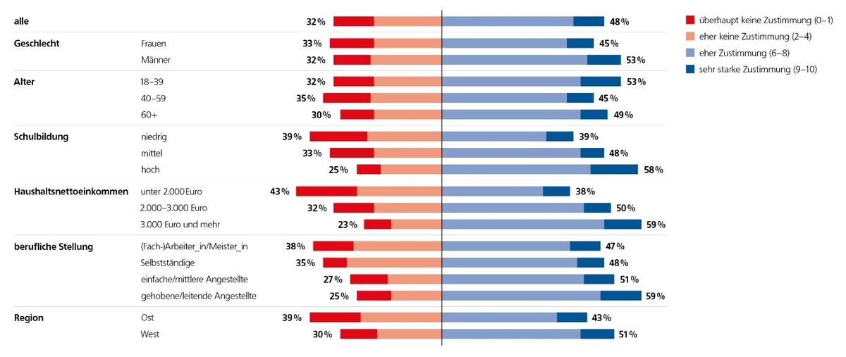 Nur rund die Hälfte der Bevölkerung in Deutschland hat das Gefühl, genügend Anerkennung und Respekt zu erfahren. Im Dezember 2018 fühlten sich 57 Prozent wertgeschätzt. Während der Pandemie ist ein leichter Rückgang auf 52 Prozent im Oktober 2020, 48 Prozent im Mai 2021 sowie 51 Prozent im Oktober 2021 zu verzeichnen. Die Auswertung nach soziodemografischen Subgruppen zeigt jedoch auch, dass das Gefühl in der Gesellschaft ungleich verteilt ist. Je geringer das Einkommen oder die formale Bildung, desto weniger Anerkennung und Respekt werden empfunden. Generell wird eine „Verrohung“ der Gesellschaft beklagt mit abnehmender Akzeptanz gegensätzlicher Meinungen sowie dem Fehlen guter Umgangsformen und Höflichkeit.Alles in allem bekommen Menschen wie ich in Deutschland den Respekt und die Anerkennung, die sie verdienen.