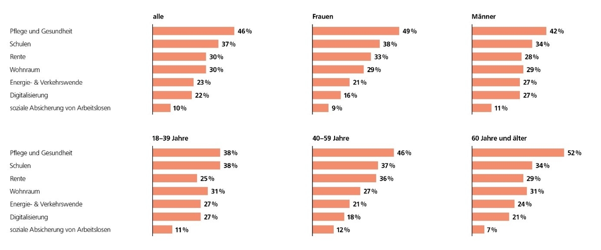 In der Bevölkerung besteht ein starker Wunsch nach einer anpackenden Politik mit Plan und Weitsicht. Bereits im Mai 2021 stimmten 62 Prozent eher der Sichtweise zu, dass es eine neue Politik brauche, die Ideen für die Zukunft entwickelt, Dinge anpackt und zu Ende bringt. Breiter Konsens besteht auch darin, dass Deutschland mehr investieren müsse, um die zukünftigen Herausforderungen zu bewältigen. Die präferierten Bereiche für Investitionen sind dabei Pflege/Gesundheit, Schulen, Renten und Wohnraum. Unabhängig von Alter oder Geschlecht steht das Thema „Pflege/Gesundheit“ bei allen an erster Stelle. Jüngere Menschen (18-39 Jahre) erachten Investitionen in Schulen als gleich wichtig (38 Prozent). Im Vergleich zu anderen Altersgruppen sind ihnen mit jeweils 27 Prozent auch Investitionen in Energie- und Verkehrswende sowie Digitalisierung wichtig (insgesamt 23 bzw. 22 Prozent).Wenn Sie sich für einen dieser Bereiche entscheiden müssten, in welchen sollte die Politik als Erstes investieren? Und in welchen als Zweites?