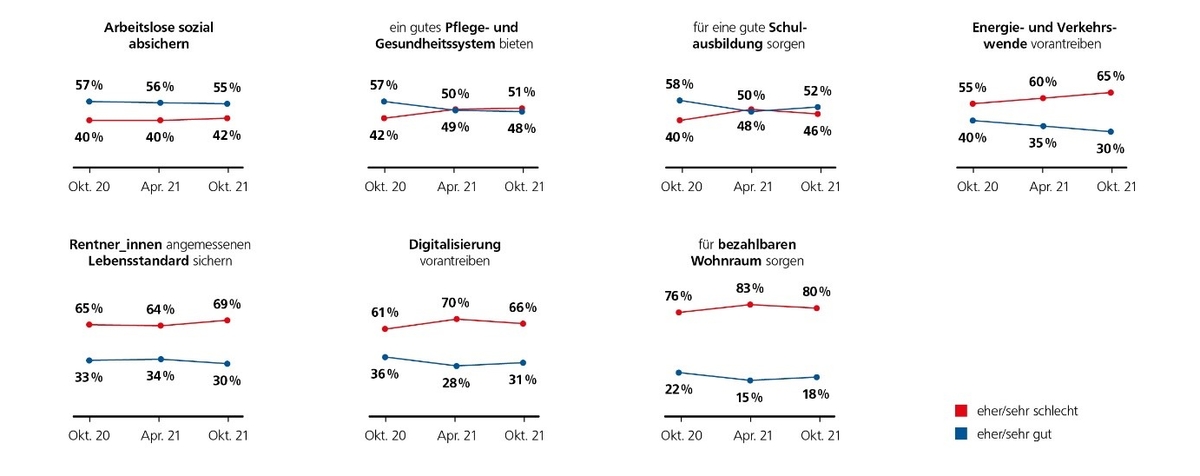 Im Verlaufe der Pandemie ist in allen Bereichen die Zufriedenheit mit der Erfüllung staatlicher Aufgaben zurückgegangen. Besonders hoch ist die Unzufriedenheit hinsichtlich bezahlbaren Wohnraums, Renten, Energie- und Verkehrswende sowie Digitalisierung. Zu Beginn der Pandemie war noch eine Mehrheit zufrieden mit dem Pflege- und Gesundheitssystem sowie der Qualität der Schulausbildung. Inzwischen sind die positiven und negativen Bewertungen ungefähr gleich stark vertreten. Am stärksten angestiegen ist die Unzufriedenheit über das Voranschreiten der Energie- und Verkehrswende. Im Oktober 2020 beurteilten 55 Prozent der Befragten die Erfüllung staatlicher Aufgaben als schlecht an, ein Jahr später fällten 65 Prozent ein negatives Urteil.Bitte sagen Sie mir für jede der folgenden Aufgaben, ob der Staat diese Ihrer Meinung nach sehr gut, gut, schlecht oder sehr schlecht erfüllt?