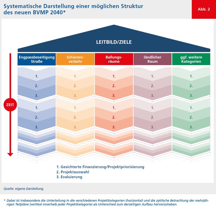 Eine möglichen Struktur des neuen BVMP 2040 würde sich demnach wie folgt darstellen und sich vom derzeitigen Aufbau des BVWP vor allem dadurch durch die Unterteilung in die verschiedenen Projektkategorien (horizontal) und die zyklische Betrachtung der mehrjährigen Teilpläne (vertikal innerhalb jeder Projektkategorie) unterscheiden.