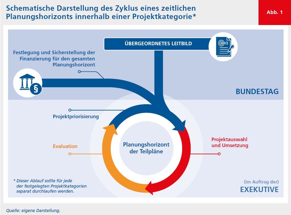 Eine regelmäßige Evaluierung des BVMPs und seiner Teilpläne sollte integrierter Bestandteil des neuen BVMP-Verfahrens werden. Ein typischer Ablauf eines mehrjährigen Planungshorizonts eines Teilplans (Projekt-Kategorie) bzw. eines Lebenszyklus würde sich wie in Abbildung 1 darstellen.