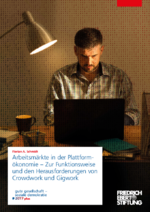 Publikation Neues Wachstum. Gestaltende Wirtschafts- und Finanzpolitik Arbeitsmärkte in der Plattformökonomie Arbeitsmärkte in der Plattformökonomie Schmidt, Florian A. Zur Publikation Zur Funktionsweise und den Herausforderungen von Crowdwork und Gigwork Die sogenannte „Sharing Economy“ ist zurzeit in aller Munde. Uber, Airbnb, Helpling und viele andere plattformbasierte Geschäftsmodelle versprechen das Aufbrechen vermeintlich verknöcherter und wenig verbraucherfreundlicher Wirtschaftszweige und die Schaffung neuer flexibler, kosteneffizienter, serviceorientierter Angebote. Und in der Tat leisten digitale Plattformen, die Anbieter und Nachfrager von Produkten oder Dienstleistungen weltweit in Sekundenschnelle über das Internet vermitteln, wertvolle Dienste. Gleichwohl mehrt sich die Kritik an den digitalen Plattformen. So basieren die Geschäftsmodelle zur Vermittlung von Dienstleistungen in der Regel auf der Beschäftigung von Soloselbständigen, die auf eigene Rechnung, mit schlechter Entlohnung und ohne soziale Absicherung die Arbeit verrichten. Weder die Auftraggeber_innen noch die Plattformbetreiber übernehmen Arbeitgeberpflichten gegenüber den selbständig Beschäftigten. Plattformgeschäftsmodelle gibt es mittlerweile in ganz unterschiedlichen Bereichen, in der vorliegenden Analyse geht es um die gesellschaftspolitisch wohl umstrittensten: digitale Arbeitsplattformen bzw. Plattformen zur kommerziellen Vermittlung von Dienstleistungen. Die Publikation erläutert die grundlegenden Funktionsmechanismen dreiseitiger Plattformmärkte und zeigt die verschiedenen Varianten und Kategorien von Dienstleistungs- bzw- Arbeitsplattformen auf. Zudem werden die spezifischen Besonderheiten und Herausforderungen der unterschiedlichen Kategorien von Dienstleistungsplattformen erläutert und mögliche Ansatzpunkte für die politische Einflussnahme aufgezeigt. For the English translation of the study, please follow this link.
