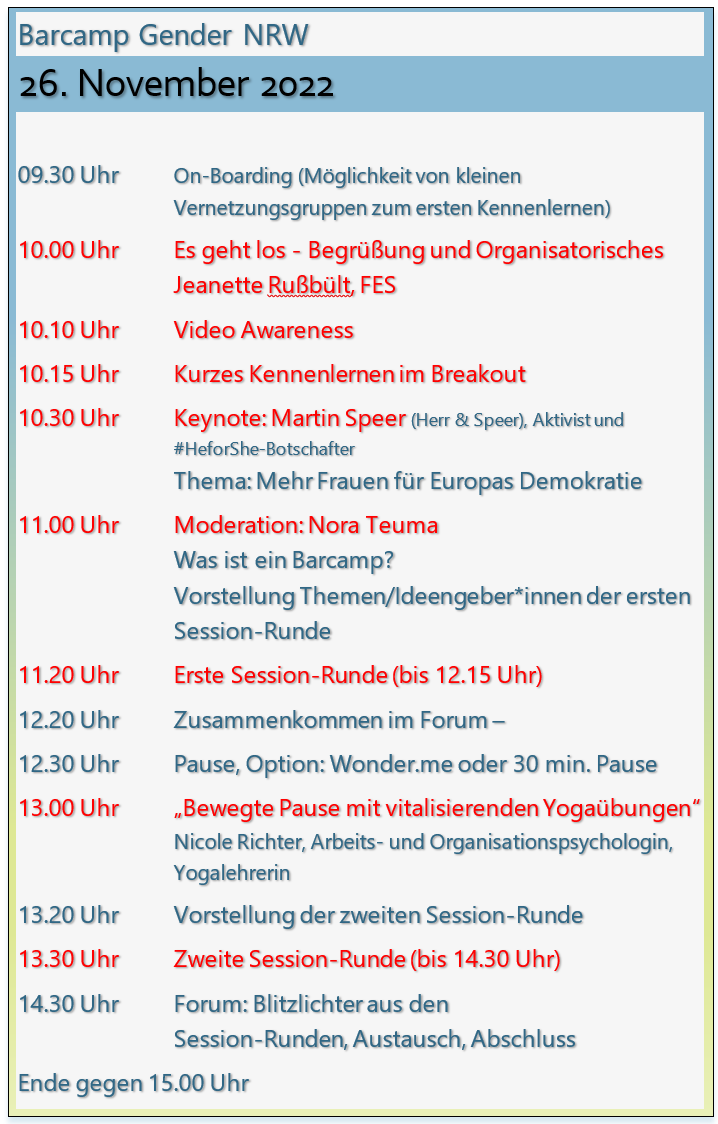 Es wird die Möglichkeit zum Austausch und zur Vernetzung geben, aber auch zahlreiche Worskhops zu Feminismus, Diversität und Medien. Welche Antworten bietet der intersektionale Feminismus in diesen Zeiten? Wie wollen wir in Zukunft miteinander leben, und wie können wir mehr Gerechtigkeit umsetzen? Wie sind wir gegen Hate Speech gewappnet? Wie ändern wir gemeinsam Machtverhältnisse? Welche Ideen hast Du dazu? Ein Tag voller Empowerment! Die FES bietet zusammen mit dem Gender Netzwerk NRW das Barcamp an und freut sich auf Deine Teilnahme! Die Teilnahme ist kostenfrei.