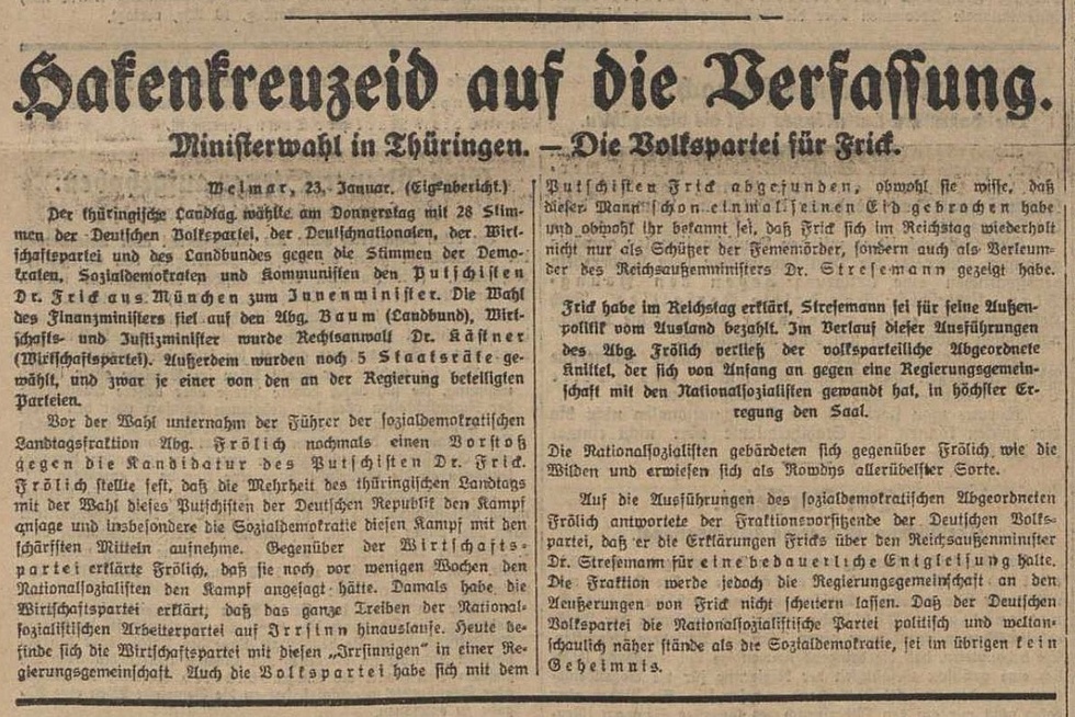 Zur Wahl und Vereidigung Fricks als Innenminister am 23.01. berichtet der „Vorwärts“ aus dem Thüringer Landtag. Demnach appellierte der SPD-Fraktionsvorsitzende August Fröhlich dort an die Abgeordneten der DVP, Frick nicht zu wählen, da dieser den kurz zuvor gestorbenen DVP-Außenminister Stresemann als „vom Ausland bezahlt“ diffamiert habe. Der DVP-Politiker Friedrich Knittel, der sich gegen die Koalition eingesetzt hatte, habe daraufhin „in höchster Erregung“ den Plenarsaal verlassen. Die dann folgende Reaktion des Fraktionsvorsitzenden der DVP Theodor Bauer beschreibt der „Vorwärts“ so: