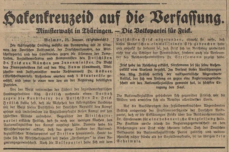 Die Regierung kommt nun doch zustande. Der „Vorwärts“ berichtet darüber am nächsten Morgen in einem großen Artikel und beleuchtet nun ausführlicher die Beteiligung Fricks am Putschversuch von 1923. Auch der zuvor erwähnte Auftritt Hitlers in Weimar wird nun genauer betrachtet. Nach einem Bericht aus der „Weimarer Zeitung“ wird Hitlers Rede wörtlich zitiert: