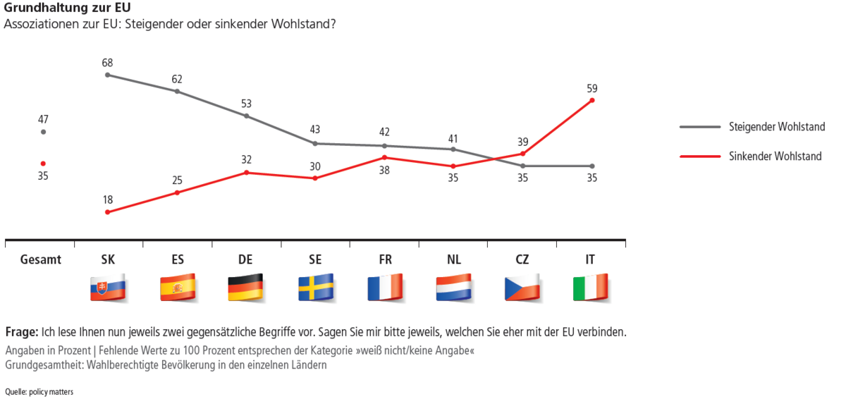 Darüber hinaus hat die EU das verbreitete Image, ein Elitenprojekt zu sein, von dem die schwächeren sozialen Schichten weniger profitieren. Hier war die Skepsis gegenüber der europäischen Gemeinschaft lange Zeit am höchsten. Es gibt jedoch Anhaltspunkte, dass diese gesellschaftliche Spaltung in der Bewertung der EU bald Geschichte sein könnte. Dafür spricht, dass sich die Grundhaltung gegenüber der EU seit 2015 nicht nur in den oberen Schichten, sondern gesamtgesellschaftlich zum Positiven verändert. In manchen Ländern, etwa in Deutschland und Frankreich, ist der Imagegewinn in den unteren Schichten stärker ausgeprägt als in den bessergestellten gesellschaftlichen Gruppen – in Deutschland zeigt sich heute sogar eine Mehrheit der sozial Schwachen (54 Prozent) von den Vorteilen einer EU-Mitgliedschaft ihres Landes überzeugt. Mit Ausnahme der Tschechen sprechen sich alle Nationen, die an der acht-Länder-Studie teilgenommen haben, mehrheitlich für eine stärkere Zusammenarbeit und gegen einen Rückfall in Nationalismen aus.