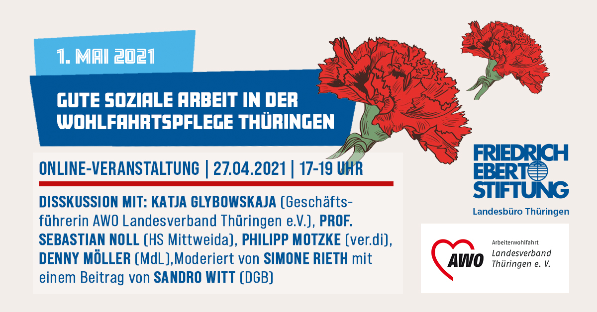 Spitzenverbände der Freien Wohlfahrtspflege in Thüringen stehen vor einer Vielzahl an Herausforderungen. Fachkräftemangel und Arbeitsbedingungen sind dabei nur zwei der wichtigsten Stichworte, aber auch die Digitalisierung von Arbeitsmodellen führt zu neuen Fragen hinsichtlich Mitbestimmung, Familienfreundlichkeit und Flexibilität. Anlässlich des 1. Mai - dem Tag der Arbeit - möchten wir den Diskurs über diese aktuellen Herausforderungen eröffnen. Wir wollen die Frage stellen wie es dazu kam, dass Wohlfahrt zu Sozialwirtschaft wurde und warum es scheinbar immer schwieriger wird Werte zu erhalten, die der Wohlfahrtspflege eigentlich zugrunde liegen. Welche Strategien und Lösungen halten die Träger in Thüringen bereit? Wie kann eine gemeinsame Strategie aussehen und was muss von Politik gefordert werden? In einer zweistündigen Online- Podiumsdiskussion lassen wir unterschiedliche Akteure der Wohlfahrtspflege, Wissenschaft und Praxis zu Wort kommen. Diskutieren Sie mit!Referent_innen: - Katja Glybowskaja, Geschäftsführerin des AWO Landesverbandes Thüringen e.V.- Prof. Sebastian Noll, Hochschule Mittweida- Denny Möller, MdL - Phillip Motzke, ver.diMit einer Videobotschaft von Sandro Witt, DGB Thüringen.Moderation: Simone Rieth Wir bitten um Anmeldung. Den Zugangslink zum Zoom-Raum erhalten Sie am 26.04. per Mail.