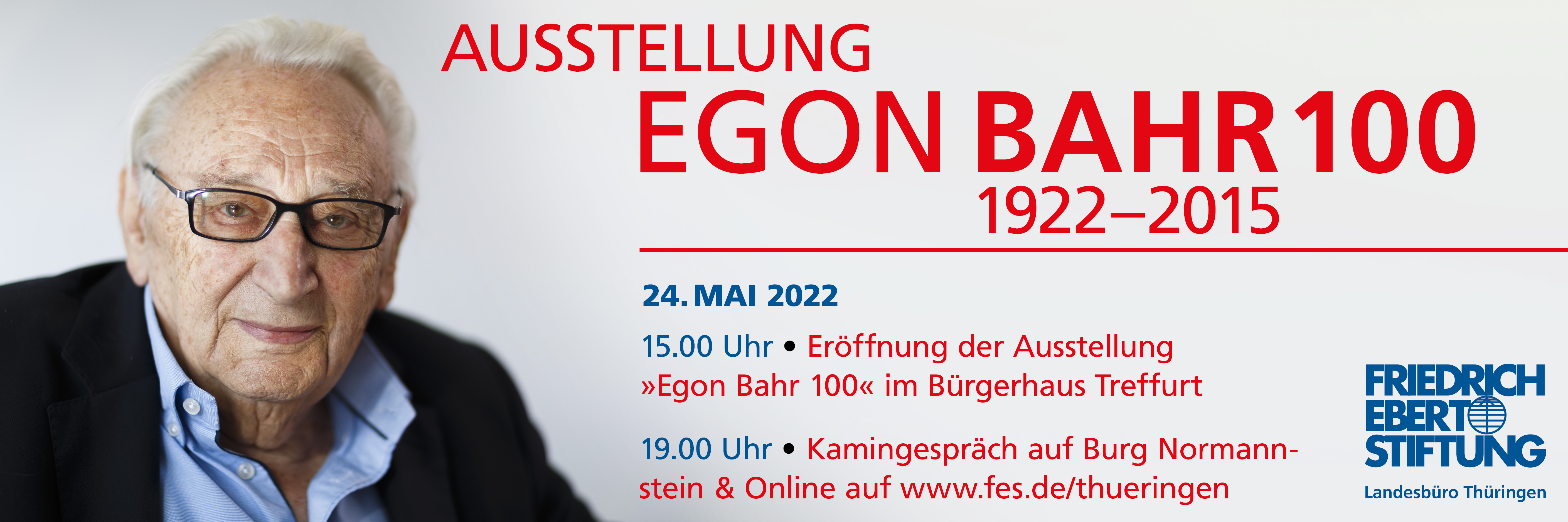 Am 18. März wäre Egon Bahr, wichtigster Berater von Bundeskanzler Willy Brandt, Architekt der Ostverträge und der Entspannungspolitik – und einer der größten Söhne der Stadt Treffurt - 100 Jahre alt geworden.Zu diesem Anlass eröffnen das Landesbüro Thüringen der Friedrich-Ebert-Stiftung und die Stadt Treffurt, die Geburtsstadt Egon Bahrs, am 24. Mai erstmalig die Ausstellung „Egon Bahr 100“; die Biographie einer außergewöhnlichen deutschen politischen Persönlichkeit seit 1922.Ein wichtiges Anliegen der Ausstellung ist es, neben den großen politischen Verdiensten auch Einblicke in die Persönlichkeit und den Menschen Egon Bahr zu zeigen.Egon Bahr erlebte als junger Mann die Zeit der nationalsozialistischen Herrschaft, als RIAS-Radiomoderator den Aufstand des 17. Juni 1953, als Sprecher des Berliner Senats den Mauerbau am 13. August 1961 und den Kalten Krieg in all seinen Facetten – dann bereits in verantwortlichen Positionen der deutschen Bundesregierung. Dabei stellt die Entwicklung seiner These „Wandel durch Annäherung“ und die Ausarbeitung der Ostverträge in den 70er Jahren einen Schwerpunkt der Ausstellung dar. Abschließend wird unter anderem sein Beitrag zur deutschen Wiedervereinigung erörtert.Eröffnung der Ausstellung „Egon Bahr 100“ am 24. Mai 2022, 15 Uhr im Bürgerhaus der Stadt Treffurtin Anwesenheit von Frau Prof. Adelheid Bahr.BegrüßungMichael Reinz, Bürgermeister der Stadt TreffurtMirko Hempel, Leiter Landesbüro Thüringen der Friedrich-Ebert-StiftungGrußworteGeorg Maier, Thüringer Minister für Inneres und KommunalesDie Ausstellung wird gefördert und ausgerichtet durch das Landesbüro Thüringen der Friedrich-Ebert-Stiftung, in Zusammenarbeit mit dem ost-west-forum Gut Gödelitz e.V. 1998 und Prof. Adelheid Bahr.Die Ausstellung „Egon Bahr 100“ ist vom 24. Mai bis zum 14. Juni 2022 im Bürgerhaus (Puschkinstraße 3, 99830 Treffurt) am Mo/ Mi/ Do/ Fr 10.00-15.00 Uhr und Di 10.00-18.00 Uhr zu sehen. Für Gruppen von 10 Personen und mehr bitten wir um Voranmeldung unter 036923 515-42 oder info(at)treffurt.de .