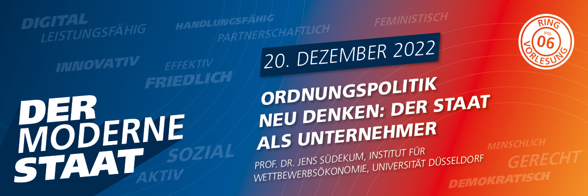 Die dritte Ringvorlesung:mit Prof. Dr. Jens Südekum, Institut für Wettbewerbsökonomie, Universität DüsseldorfWas zeichnet einen modernen und handlungsfähigen Staat aus? Welche Ressourcen und welche Reformen braucht er? Wie kann der Staat effektiv und partizipativ sein? Welche Macht braucht der Staat und wie wird sie vergeben und kontrolliert?Diese und andere Fragen stellt die Friedrich-Ebert-Stiftung in Zusammenarbeit mit der Universität Bonn in den Fokus der Ringvorlesung im Wintersemester 2022/2023. Am 20. Dezember analysiert der einflussreiche Ökonom Prof. Dr. Jens Südekum das Verhältnis von Staat und Markt. Der Staat sollte nicht nur die Rahmenbedingungen für die Wirtschaft setzen, sondern durch Investitionen und Innovationen aktive Industriepolitik betreiben. Zumal stärkeres staatliches Engagement nicht nur Risiken vermindern kann, sondern oftmals auch den längeren Atem besitzt. Südekum ist Professor am Institut für Wettbewerbsökonomie, Universität Düsseldorf und beschäftigt sich in seiner Forschung mit internationalem Handel, den Arbeitsmarktauswirkungen von Globalisierung und Digitalisierung sowie mit Stadtökonomik und Regionalpolitik.Wo?Universität Bonn, Hauptgebäude, Hörsaal I