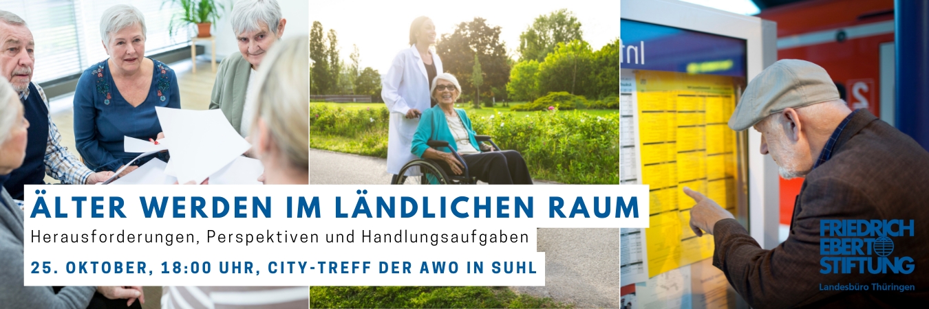 Älter werden wir alle, aber wie sind unsere Städte und Dörfer darauf vorbereitet? Wie ist Teilhabe, Gesundheitsversorgung und Wohnen im Alter möglich? Und welcher Rolle kommen ältere Menschen in unserer Gesellschaft überhaupt zu? Wir laden Sie herzlich ein, mit uns über die genannten Fragen nachzudenken, auszutauschen und Handlungsempfehlungen zu erarbeiten. Wir wollen dabei den Kontext Ostdeutschlands und der Transformation nicht aus dem Blick verlieren, aber auch die Situation im Zuge der Corona-Krise genauer analysieren. Diskutieren Sie mit uns am 25.10. ab 18 Uhr im City-Treff der AWO in Suhl (Pfarrstraße 10).Podiumsgäste sind:Diana Lehmann, MdLIngrid Mischke, Seniorenhilfe Suhl Dr. Jan Steinhaussen, Landesseniorenrat Thüringen Moderation und Gesprächsleitung:Dr. Franziska Schmidtke, FES Thüringen