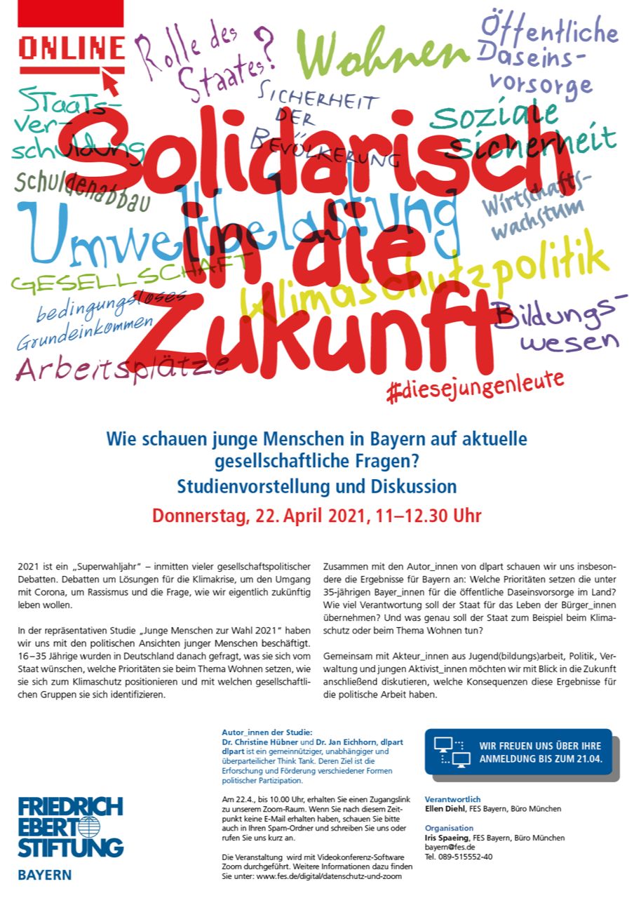 Studienvorstellung und Diskussion2021 ist ein "Superwahljahr" - inmitten vieler gesellschaftspolitischer Debatten. Debatten um Lösungen für die Klimakrise, um den Umgang mit Corona, um Rassismus und die Frage, wie wir eigentlich zukünftig leben wollen.In der repräsentativen Studie "Junge Menschen zur Wahl 2021" haben wir uns mit den politischen Ansichten junger Menschen beschäftigt. 16-35-Jährige wurden in Deutschland danach gefragt, was sie sich vom Staat wünschen, welche Prioritäten sie beim Thema Wohnen setzen, wie sie sich zum Klimaschutz positionieren und mit welchen gesellschaftlichen Gruppen sie sich identifizieren. Zusammen mit den Autor_innen von d|part schauen wir uns insbesondere die Ergebnisse für Bayern an: Welche Prioritäten setzen die unter 35-jährigen Bayer_innen für die öffentliche Daseinsvorsorge im Land? Wie viel Verantwortung soll der Staat für das Leben der Bürger_innen übernehmen? Und was genau soll der Staat zum Beispiel beim Klimaschutz oder beim Thema Wohnen tun?Gemeinsam mit Akteur_innen aus Jugend(bildungs)arbeit, Politik, Verwaltung und jungen Aktivist_innen möchten wir mit Blick in die Zukunft anschließend diskutieren, welche Konsequenzen diese Ergebnisse für die politische Arbeit haben.Mit:Dr. Christine Hübner und Dr. Jan Eichhorn, Think Tank d|part, Autor_innen der Studie "Junge Menschen zur Wahl 2021. Wie schauen jungen Menschen in Deutschland vor der Bundestagswahl 2021 auf aktuelle gesellschaftliche Fragen?"Andreas Mehltretter, junger SPD-Politiker (u. a. Referent für Wirtschaft und Digitalisierung im Stadtrat Freising), Doktorand an der LMU in MünchenWir freuen uns über Ihre Anmeldung bis zum 21.4.2021. Am 22.4., bis 10.00 Uhr, erhalten Sie einen Zugangslink zu unserem Zoom-Raum. Wenn Sie nach diesem Zeitpunkt keine E-Mail erhalten haben, schauen Sie bitte auch in Ihren Spam-Ordner und schreiben Sie uns oder rufen Sie uns kurz an.Die Veranstaltung wird mit Videokonferenz-Software Zoom durchgeführt. Weitere Informationen dazu finden Sie unter: www.fes.de/digital/datenschutz-und-zoom