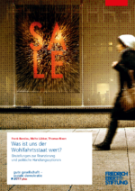 Publikation Gute Gesellschaft – Soziale Demokratie 2017plus | Gute Arbeit und sozialer Fortschritt Was ist uns der Wohlfahrtsstaat wert? Was ist uns der Wohlfahrtsstaat wert? Bandau, Frank ; Lübker, Malte ; Rixen, Thomas Zur Publikation Einstellungen zur Finanzierung und politische Handlungsoptionen Die Menschen in Deutschland wollen einen starken Wohlfahrtsstaat. Die meisten Bürger_innen halten das Ausmaß der sozialen Ungleichheit für zu groß und sind dafür, staatliche Leistungen in sämtlichen wohlfahrtsstaatlichen Handlungsfeldern zu stabiliseren und auszubauen. Wie genau aber notwendige Reformen finanziert werden sollen, darüber gehen die Meinungen auseinander. Wie kommen die unterschiedlichen Einstellungen der Bürger_innen zu den Finanzierungsoptionen zustande? Und wie kann die Politik reagieren? Die vorliegende Publikation liefert Antworten auf diese Fragen und leistet damit einen Beitrag zu der zentralen Debatte darüber, wie die Zukunft unseres Wohlfahrtsstaates finanziert werden soll. Ansprechpartner in der FES: Thomas Absmayr