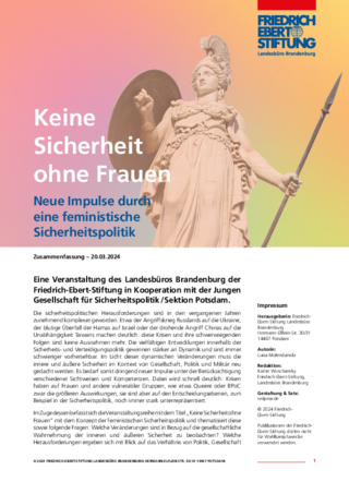 neue Impulse durch eine feministische Sicherheitspolitik : Zusammenfassung - 20.03.2024 : eine Veranstaltung des Landesbüros Brandenburg der Friedrich-Ebert-Stiftung in Kooperation mit der Jungen Gesellschaft für Sicherheitspolitik / Sektion Potsdam