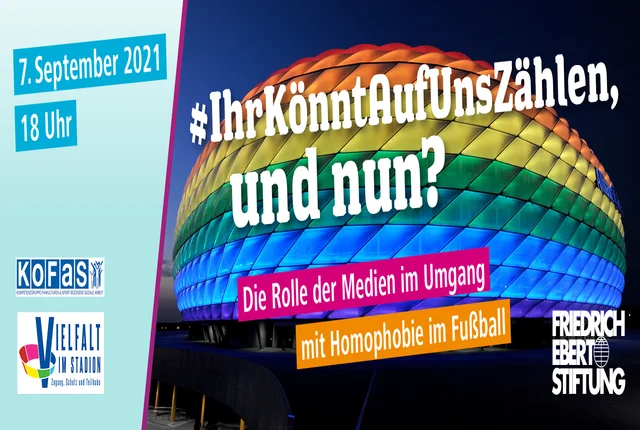 Veranstaltung Rückblick Livestream-Veranstaltung #IhrKönntAufUnsZählen, und nun? Die Rolle der Medien im Umgang mit Homophobie im Fußball Veranstaltung und Livestream zum Umgang der Medien mit Homofeindlichkeit im Männerfußball Bild: Urheber: SZ Photo Die Debatte um ‚Homophobie im Fußball’ ist medial aktuell sehr präsent: Neben der Kampagne #IhrKönntAufUnsZählen des Magazins 11FREUNDE, hat mit dem kicker eine weitere große Fußballzeitschrift das Thema zweimal in Folge prominent platziert. Dabei stieß vor allem die Social Media Kampagne von 11FREUNDE auf große Resonanz. Millionenfach wurde der Hashtag geteilt und über Homofeindlichkeit im Fußball diskutiert. Damit hat diese Aktion einen Perspektivwechsel eingeleitet: Weg von dem Starren auf das Outing eines Profis und hin zu seinem Umfeld. Denn bislang ist die Debatte eher einseitig geführt und immer wieder auf die Frage nach einem Coming Out reduziert worden. Gleichzeitig wird auch aktuell das Bild vom Fußball als harter Männersport nicht angekratzt und die Frage nach einem Outing steht weiterhin im Raum. Zeit also für eine Zwischenbilanz. Welche Rolle haben Sportmedien bisher in der (De-)Konstruktion von Homophobie im Fußball gespielt? Welchen Einfluss hat eine Kampagne wie #IhrKönntAufUnsZählen und vor allem: Wie geht es jetzt weiter? Diese Fragen haben wir am 07. September 2021 gemeinsam mit Ihnen diskutiert. Im Mitschnitt können Sie die gesamte Veranstaltung nachschauen: Dieses Video wird über Youtube zur Verfügung gestellt. Um es anzusehen, müssen Sie unseren Marketing-Cookies zustimmen. Weitere Hinweise finden Sie in den ausführlichen Datenschutzhinweisen. Marketing-Cookies akzeptieren und Video laden Programm Begrüßung Florian Dähne, Friedrich-Ebert-Stiftung Cristin Gießler, KoFaS Impulse Ronny Blaschke, Journalist und Autor Alfonso Pantisano, Lesben- und Schwulenverband Deutschland Diskussion Jörg Jakob, kicker Manuela Kay, L-Mag/Siegessäule Tim Jürgens, 11FREUNDE Nicole Selmer, ballesterer Moderation: Mara Pfeiffer, Journalistin Das Programm als pdf