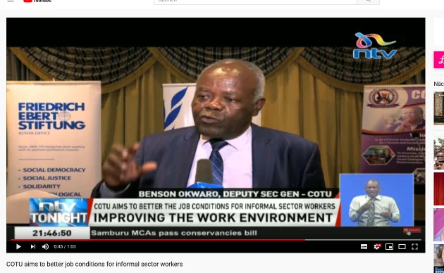 News Video Starke Gewerkschaften | Gewerkschaften international Kenianische Gewerkschaften übernehmen Verantwortung für informell Beschäftigte 17.09.2019 Der kenianische Gewerkschaftsdachverband positioniert sich erstmalig öffentlich auf einer gemeinsamen Konferenz mit ILO und FES für mehr Unterstützung informell Beschäftigter. Bild: Urheber: Mietje Kuhnhardt Mittwoch, 18.09.2019 Gute Arbeit, faire Löhne News Gewerkschaften international Weltwirtschaft und Unternehmensverantwortung Wie sich informelle Beschäftigung auf die soziale Lebenslage auswirkt Repräsentativen Umfrage: Informell Beschäftigte in Afrika organisieren sich selbst, äußern aber auch klare Vorstellungen gegenüber dem Staat. Ansprechpartner Bild: Urheber: FES / Bundesfoto Christopher Forst 0173 7057736 Christopher.Forst(at)fes.de Bild: Urheber: ntv Kenya (Youtube) 83 % aller Kenianer_innen arbeiten unter den prekären Bedingungen des informellen Sektors. Sie haben oft keinen Arbeitsvertrag, erhalten Löhne meist unter dem Mindestlohn und sind selten kranken- oder rentenversichert. Die einflussreichen kenianischen Gewerkschaften vertraten aber bisher vor allem die Anliegen der im formalen Sektor beschäftigten Menschen. Ihre Mitglieder sind daher bisher überwiegend Beschäftigte im öffentlichen Dienst. Erstmalig öffentliche politische Positionierung der Gewerkschaften zum informellen Sektor Das FES-Büro in Kenia unterstützt eine Arbeitsgruppe aus Gewerkschafter_innen und Ökonom_innen, die nun erstmals eine einheitliche und öffentliche politische Positionierung der Gewerkschaften zum informellen Sektor vorstellte. Bei einer gemeinsamen Konferenz des kenianischen Gewerkschaftsdachverbandes COTU, der Internationalen Arbeitsorganisation (ILO) und der FES Kenia legten die Gewerkschaften am 4. September 2019 in Nairobi konkrete Vorschläge vor, wie Arbeitsbedingungen und soziale Sicherheit für informell Beschäftigte verbessert werden können und welche Politikänderungen hierfür notwendig sind. Gefordert wurde von COTU unter anderem die Einrichtung einer nationalen Plattform für einen sozialen Dialog mit informell Beschäftigten und die Reform von bestehenden Gesetzen, so dass informell Beschäftigte zukünftig besser geschützt sind. Diese Vorschläge wurden dann u.a. mit Vertreter_innen des informellen Sektors, Arbeitgebervertreter_innen und dem Vize-Arbeitsminister diskutiert. Gewerkschaften erheben hierdurch einen breiteren gesellschaftspolitischen Gestaltungsanspruch als zuvor. Ihr Ziel ist es, zukünftig verstärkt prekäre Arbeit und die zunehmende Ungleichheit in Kenia über die eigene Mitgliedschaft hinaus zu bekämpfen. Gleichzeitig verabredeten die Gewerkschaften mit den vertretenen Organisationen des informellen Sektors eine engere Zusammenarbeit. Darüber hinaus möchten die Gewerkschaften von nun an verstärkt neue Mitglieder unter informell Beschäftigten gewinnen. Das ist ein wichtiger Schritt im Kampf gegen zunehmende Ungleichheit in Kenia. Abkommen zwischen ILO und FES für mehr Zusammenarbeit Im Rahmen der Konferenz wurde auch ein Abkommen zwischen der ILO und dem Referat Afrika der FES unterzeichnet, welches zukünftig die Zusammenarbeit zu verschiedenen Themen auf dem afrikanischen Kontinent verstärken soll. Eine Priorität ist hierbei insbesondere die Zusammenarbeit mit Gewerkschaften zum informellen Sektor. Die ILO-Direktorin für Afrika, Cynthia Samuel-Olonjuwon, nannte die Konferenz in Nairobi einen wichtigen Schritt, um die Arbeitsbedingungen im informellen Sektor zu verbessern und freut sich auf die Zusammenarbeit hierzu mit der FES und ihren Partnern. Dieses Video wird über Youtube zur Verfügung gestellt. Um es anzusehen, müssen Sie unseren Marketing-Cookies zustimmen. Weitere Hinweise finden Sie in den ausführlichen Datenschutzhinweisen. Marketing-Cookies akzeptieren und Video laden