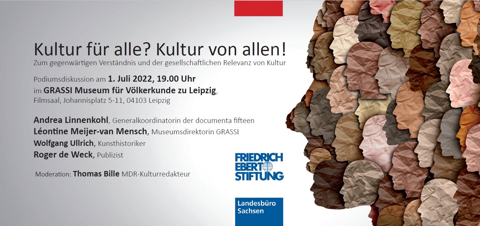 Rückblick Kultur und Politik Kultur für alle? Kultur von allen! 01.07.2022 19:00 bis 01.01.1970 01:00 - GRASSI-Museum, Johannisplatz 5-11, 04103 Leipzig, Kinosaal Die 1979 erschienene Streitschrift "Kultur für alle" von Hilmar Hoffmann hat die deutsche Kulturpolitik von Grund auf verändert. Als einer der ersten Politiker erkannte Hoffmann die Bedeutung von Kultur und Bildung für die Gesellschaft und forderte die Teilhabe breiter Bevölkerungsschichten an Theatern, Bibliotheken und Museen. Standen bis dahin wenige Bildungsbürgerinnen und Bürger vor einem ausgestellten Gemälde, so sollten sich fortan viele mit ihren Kindern davor versammeln. Mit den Jahren veränderte sich nicht nur die Rezeption von Kultur, sondern das gesamte Kulturverständnis. Der Strukturwandel, wie wir ihn zurzeit erleben, geht mit einigen gesellschaftlichen Verwerfungen einher - ein Kulturkampf, den Roger de Weck in seinem Buch "Die Kraft der Demokratie" beschreibt. Der Soziologe und Kulturwissenschaftler Andreas Reckwitz bezeichnet diese "Kulturkonflikte als Kampf um die Kultur" und entwickelt seinerseits mit der Idee der Kultur des Allgemeinen eine kritische Gegenkraft. Museen und Kunstausstellungen leisten ihrerseits Entwicklungsarbeit - etwa die "documenta fifteen", kuratiert vom Künstler_innenkollektiv ruangrupa aus Jakarta, oder des Grassimuseums für Völkerkunde in Leipzig mit dem Zukunftsprogramm REINVENTING GRASSI.SKD auf dem Weg zu einem Netzwerkmuseum. Wolfgang Ullrich spricht in seinem Buch "Die Kunst nach dem Ende der Autonomie" von der Entfaltung einer neuen Kunst, die die Kräfte möglichst vieler Disziplinen in sich bündelt. So verstanden würde Kultur von allen geschaffen, die von allen wahrgenommen wird. Darüber und über Ihre Fragen möchten wir an diesem Abend diskutieren. In der Podiumsdiskussion: Andrea Linnenkohl, General Coordinator and Artistic Team documenta fifteen Léontine Meijer-van Mensch, Direktorin der Völkerkundemuseen in Leipzig, Dresden, Herrnhut Prof. Dr. Wolfgang Ullrich, Kunsthistoriker und Kulturwissenschaftler Roger de Weck, Publizist Moderation: Thomas Bille, Journalist und Moderator, MDR-Kultur Der Eintritt ist frei! Freitag, 01.07.22 Leipzig freie Plätze Kultur für alle? Kultur von allen! Veranstaltungsnummer: 260737 – als .ics herunterladen Ort: GRASSI Museum, Johannisplatz 5-11, 04109 LeipzigDie 1979 erschienene Streitschrift "Kultur für alle" von Hilmar Hoffmann hat die deutsche Kulturpolitik von Grund auf verändert. Als einer der ersten Politiker erkannte Hoffmann die Bedeutung von Kultur und Bildung für die Gesellschaft und forderte die Teilhabe breiter Bevölkerungsschichten an Theatern, Bibliotheken und Museen.Standen bis dahin wenige Bildungsbürgerinnen und Bürger vor einem ausgestellten Gemälde, so sollten sich fortan viele mit ihren Kindern davor versammeln. Mit den Jahren veränderte sich nicht nur die Rezeption von Kultur, sondern das gesamte Kulturverständnis. Der Strukturwandel, wie wir ihn zurzeit erleben, geht mit einigen gesellschaftlichen Verwerfungen einher - ein Kulturkampf, den Roger de Weck in seinem Buch "Die Kraft der Demokratie" beschreibt.Der Soziologe und Kulturwissenschaftler Andreas Reckwitz bezeichnet diese "Kulturkonflikte als Kampf um die Kultur" und entwickelt seinerseits mit der Idee der Kultur des Allgemeinen eine kritische Gegenkraft. Museen und Kunstausstellungen leisten ihrerseits Entwicklungsarbeit - etwa die "documenta fifteen", kuratiert vom Künstler_innenkollektiv ruangrupa aus Jakarta, oder des Grassimuseums für Völkerkunde in Leipzig mit dem Zukunftsprogramm REINVENTING GRASSI.SKD auf dem Weg zu einem Netzwerkmuseum.Wolfgang Ullrich spricht in seinem Buch "Die Kunst nach dem Ende der Autonomie" von der Entfaltung einer neuen Kunst, die die Kräfte möglichst vieler Disziplinen in sich bündelt. So verstanden würde Kultur von allen geschaffen, die von allen wahrgenommen wird. Darüber und über Ihre Fragen möchten wir an diesem Abend diskutieren.Es diskutieren:- Andrea Linnenkohl, General Coordinator and Artistic Team documenta fifteen - Léontine Meijer-van Mensch, Direktorin der Völkerkundemuseen in Leipzig, Dresden, Herrnhut - Prof. Dr. Wolfgang Ullrich, Kunsthistoriker und Kulturwissenschaftler - Roger de Weck, Publizist Moderation:- Thomas Bille, Journalist und Moderator, MDR-KulturDer Eintritt ist frei! Termin Freitag, 01.07.2219:00-21:00 Uhr Teilnahmepauschale keine Veranstaltungsort GRASSI Museum, Kinosaale Johannisplatz 5-1104103 Leipzig Ansprechpartner_in Matthias Eisel Sachsen@fes.de Kontaktanschrift Friedrich-Ebert-StiftungLandesbüro SachsenBurgstraße 2504109 LeipzigTel. 0341-9602160 und -9602431, Fax 9605091E-Mail: sachsen@fes.deFriedrich-Ebert-StiftungBüro DresdenObergraben 17 A01097 DresdenTel. 0351-80468-03 und -04, Fax 0351-80468-05E-Mail: sachsen@fes.de