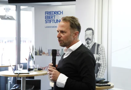 André Stinka, MdL, stellte den Bereich der persönlichen Entfaltung und die Rolle des Staates heraus. Der Gestaltungsraum müsse neu definiert werden, denn der freie Markt bestimme nicht alles und gerade das Thema Zusammenhalt sei enorm wichtig. Auf die Frage, welche politischen Instrumente und Erkenntnisse der letzten Jahre auf gegenwärtige Transformation angewandt werden können, führte Stinka die Stärkung der Mitbestimmung und die gemeinsame Entwicklung von Themen an. Strukturwandel sei möglich, aber der Staat müsse ihn begleiten: „Die Menschen müssen wissen, dass sie aufgefangen werden, und ermutigt werden, dass sie sich weiter qualifizieren.“