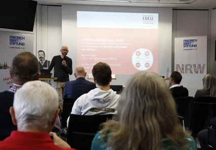 Aber welche Folgen wird der gesellschaftliche Wandel haben und wie genau wird die digitale Arbeitswelt von morgen aussehen? Wohin könnte uns die Digitalisierungsreise führen? Michael Stollt, Referatsleiter Mitbestimmungsportal am I.M.U. der Hans-Böckler-Stiftung, zeichnete in einem Impulsvortrag vier mögliche Zukunftsszenarien zur Digitalisierung der Arbeitswelt im Jahr 2035: