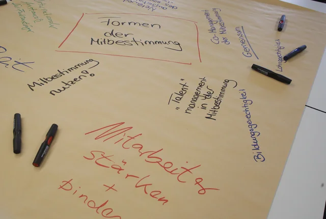 Wie die Veranstaltungsteilnehmer_innen die Transformationsprozesse wahrnehmen und ihnen entgegensehen, und welche Erfahrungen sie aus ihrer eigenen Arbeitswelt im Bereich der chemischen Industrie mitbringen, wurde anschließend in kleineren World Cafés diskutiert. Dabei standen folgende Fragen im Fokus der Gespräche: Wie kann Digitalisierung genutzt werden, damit sie unseren Arbeitsalltag verbessert, wo steht sie guter Arbeit jedoch im Weg? Welche Formen der Mitbestimmung im Unternehmen sind für die Zukunft notwendig und welche Angebote braucht es für gute Gestaltung? Und welche Rahmenbedingungen für gute Arbeit kann die Politik schaffen?