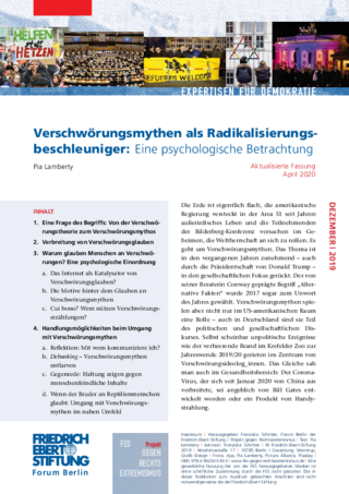 Publikation News Gegen Rechtsextremismus! Verschwörungsmythen als Radikalisierungs- beschleuniger Verschwörungsmythen als Radikalisierungsbeschleuniger Lamberty, Pia Zur Publikation Verschwörungsmythen und Erzählungen über geheime Mächte und Verschwörungen gibt es schon lange und sind mitnichten nur ein Phänomen der Digitalisierung. Ohne Zweifel verstärken die neuen Möglichkeiten jedoch die Dynamik und Verbreitung von Verschwörungserzählungen. Zudem sind Krisen und unsichere Verhältnisse auch Treibstoff für das Entstehen von solchen Ideologien. Warum es wichtig ist, wie wir solche Ideen benennen, wieso Menschen an Verschwörungen glauben und weshalb das nicht nur harmlose Spinnereien sind und was man dagegen tun kann, erläutert die FES-Mitte-Studien-Autorin Pia Lamberty in dieser Kurzexpertise.