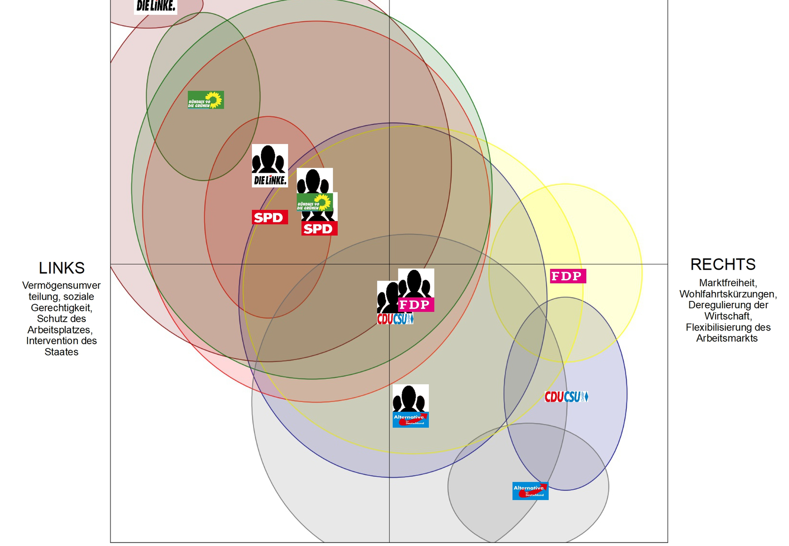 The Green’s campaign was spearheaded by two candidates from the pragmatic “Realo”-wing, Katrin Göring-Eckardt and Cem Özdemir. The party members’ decision to select these candidates was seen as an early sign for an upcoming Jamaica-coalition with CDU/CSU and FDP, but also the reaction towards a rather unsuccessful leftist campaign in 2013. However, the negotiations for such a coalition were cancelled by the Liberals. By looking at the positions in the political landscape of all three parties, the enormous ideological gap between the Greens on the one hand, and FDP and CDU/CSU on the other hand become visible on both dimensions.