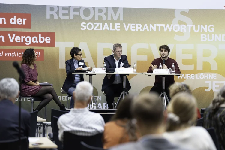 Arbeit Rückschau auf die Vergabetagung 2025 26.03.2026 Susan Javad Am 15. Oktober 2025 diskutierten auf Einladung der FES und des DGB zahlreiche Gäste über den neuerlichen Anlauf für ein Bundestariftreuegesetz und eine Vereinfachung des Vergaberechts durch ein Vergabebeschleunigungsgesetz. Bild: Urheber: FES/bundesfoto/Kurc Bereits in der letzten Legislaturperiode konnten mit dem Bundestariftreuegesetz wie auch mit dem Vergabetransformationsgesetz zwei zentrale Vorhaben kurz vor dem Start der parlamentarischen Beratung durch das Platzen der Ampel-Koalition nicht mehr umgesetzt werden. Es stand deshalb die Frage im Raum: Wie geht es unter der neuen Bundesregierung nun also weiter? Das beschlossene Sondervermögen für Infrastruktur im Umfang von 500 Milliarden Euro über die nächsten zwölf Jahre wird sehr viele öffentliche Vergaben notwendig machen – und das schnell. Damit haben sowohl das Bundestariftreuegesetz als auch das sogenannte Vergabebeschleunigungsgesetz hohe Dringlichkeit. Zeil der Tagung war es, zum einen über den aktuellen Stand der beiden Gesetzesvorhaben informieren. Der zweite Teil der Tagung ging der Frage nach, wie über die Umsetzung des Bundestariftreuegesetzes hinaus die schwindende Tarifbindung in Deutschland wieder gestärkt werden kann. Darüber hinaus gab es wieder Einblicke in die Praxis, in diesem Fall aus Österreich und Dänemark. Martin Schulz, Vorsitzender der FES, brachte in seiner Begrüßung die große praktische Bedeutung der oft abstrakt wirkenden Themen Tariftreue und Vergaberecht auf den Punkt. Der Schutz guter Arbeitsbedingungen müsse ein zentrales Ziel der Gesellschaftspolitik sein. Er sei zudem Teil des demokratischen Kampfes gegen jene Kräfte, die von der Unzufriedenheit der Menschen profitieren und damit die Demokratie untergraben. Bild: Urheber: FES/bundesfoto/Kurc Stefan Körzell, Geschäftsführendes Vorstandsmitglied des DGB, hob hervor, dass ein Bundestariftreuegesetz nicht nur große Unternehmen betrifft, sondern auch tarifgebundene Unternehmen vor unlauterem Wettbewerb durch Lohndumping in der öffentlichen Auftragsvergabe schützt. Dennoch werde das Gesetzesvorhaben von Teilen der Wirtschaft und Politik aus rein ideologischen Gründen abgelehnt. Grundsätzlich begrüßt der DGB den Gesetzentwurf, sieht jedoch an mehreren Stellen Verbesserungsbedarf – insbesondere bei den Kontrollen. Bild: Urheber: FES/bundesfoto/Kurc Wie schwierig es für die Regierungsparteien CDU/CSU und SPD ist, sich auf konkrete Inhalte des Bundestariftreuegesetzes und des Vergabebeschleunigungsgesetzes zu einigen, wurde in den Beiträgen der Parlamentarischen Staatssekretärinnen deutlich: Das Bundesministerium für Arbeit und Soziales (BMAS) legt seinen Fokus vor allem auf den Schutz guter Arbeitsbedingungen und darauf, einen weiteren Rückgang der Tarifbindung zu verhindern – diese liegt derzeit bei unter 50 Prozent. Weitere Maßnahmen zur Stärkung der Tarifbindung seien ebenfalls geplant, erklärte Katja Mast, Parlamentarische Staatssekretärin im BMAS. Dazu zählen ein digitales Zugangsrecht für Gewerkschaften zu Betrieben sowie eine Steuerbefreiung der Gewerkschaftsmitgliedsbeiträge. Bild: Urheber: FES/bundesfoto/Kurc Das Bundesministerium für Wirtschaft und Energie (BMWi), vertreten durch die Parlamentarische Staatssekretärin Gitta Connemann, setzt hingegen die Schwerpunkte auf Bürokratieabbau, Vereinfachung und Beschleunigung der Verfahren sowie den fairen Wettbewerbszugang mittelständischer Betriebe im Rahmen des Vergaberechts. Das Bundestariftreuegesetz und das Vergabebeschleunigungsgesetz sollten eigentlich noch in diesem Jahr beschlossen und zu Beginn des kommenden Jahres in Kraft treten. Aktuell ist allerdings unklar, wann beide Vorhaben den Bundestag abschließend passieren werden. Bild: Urheber: FES/bundesfoto/Kurc Im zweiten Teil der Vergabetagung gab es einen Blick auf die sehr unterschiedlichen Rahmenbedingungen in Österreich und Dänemark. Susanne Wixforth von der Kammer für Arbeiter und Angestellte für Wien machte deutlich, dass in Österreich eine Tarifbindung von 98 Prozent entscheidend zum Schutz guter Arbeitsbedingungen beiträgt. Ein Tariftreuegesetz, wie es die Gewerkschaften seit langem für Deutschland fordern, ist deshalb in Österreich nicht notwendig. Bild: Urheber: FES/bundesfoto/Kurc Dänemark wiederum setzt seit 1990 bei staatlichen Vergaben verpflichtend auf Tariftreue („labour clauses“ nach ILO-Konvention Nr. 94). Künftig sollen auch Kommunen verbindlich an diese Vorgabe gebunden werden; bisher gilt sie für sie lediglich freiwillig, erklärte Dennis Schnell-Lauritzen vom dänischen Gewerkschaftsbund Fagbevægelsens Hovedorganisation (FH). Bild: Urheber: FES/bundesfoto/Kurc Zum Abschluss der Vergabetagung stand in einer Diskussionsrunde die Stärkung der Tarifbindung im Mittelpunkt. Ghazaleh Nassibi von der IG BAU schlug unter anderem vor, Tarifbindung als Kriterium in Präqualifizierungsverfahren aufzunehmen und Tariftreue nicht nur – wie bisher – als Ausführungsbedingung, sondern als echtes Eignungskriterium im Vergabeverfahren festzuschreiben. Das Unternehmen, insbesondere in der Bauindustrie, ein starkes Interesse an einem Bundestariftreugesetz, machte Dr. Burkhard Siebert, Hauptgeschäftsführer Bauindustrieverband Hessen-Thüringen, deutlich. Er forderte, dass man bei der öffentlichen Auftragsvergabe eigentlich über die bloße Tariftreue hinausgehen müsste. Vielmehr sollten tarifgebundene Unternehmen im Rahmen der Präqualifizierung und durch Wertungsvorteile bei öffentlichen Aufträgen besonders profitieren. Jan Dieren, Bundestagsabgeordneter und Berichterstatter der SPD-Fraktion für das Thema, machte deutlich, dass die Verabschiedung des Bundestariftreuegesetzes eines der zentralen Projekte dieser Legislatur sei und der Rückenwind für das Thema aus der Veranstaltung in dieser Hinsicht sehr hilfreich für die weitere parlamentarische Arbeit sein wird. Kontakt Referat Politische Berat