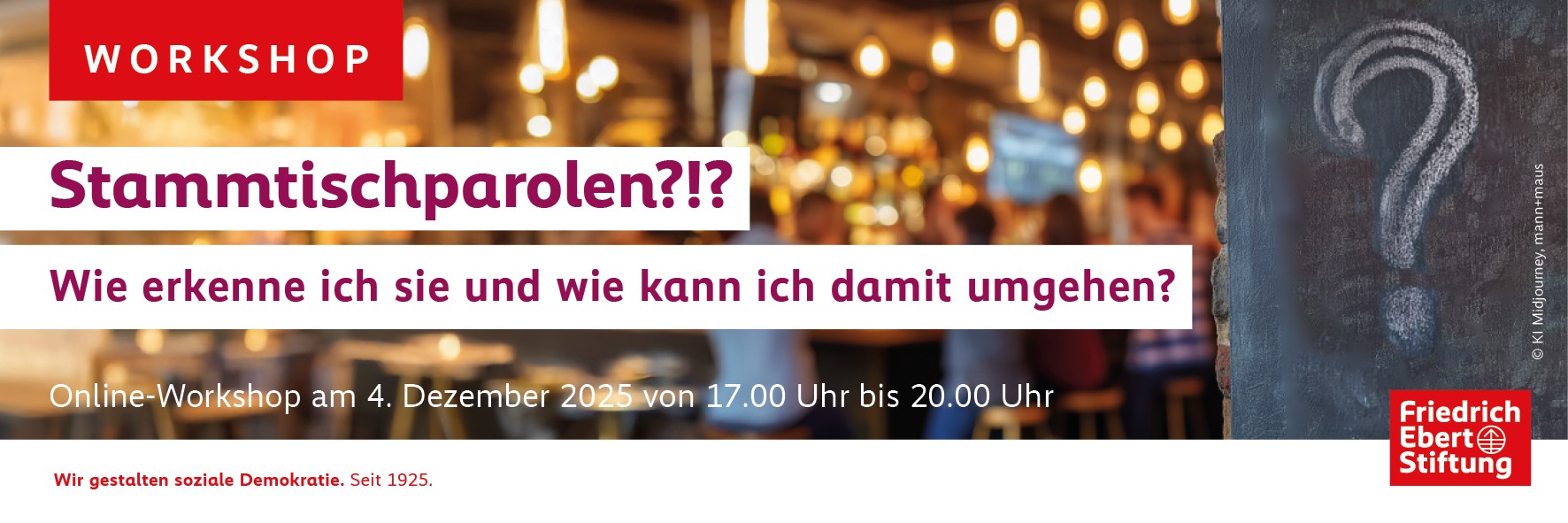 Veranstaltung News Geschichte, Kultur, Medien, Netzpolitik Online-Workshop: Stammtischparolen?!? - Wie erkenne ich sie und wie kann ich damit umgehen? 04.12.2025 17:00 bis 04.12.2025 20:00 - Online Terminexport im ICS-Format Der Workshop dauert ca. 2,5 Stunden und findet über die Plattform Zoom statt. Der Workshop ist sehr interaktiv und setzt auf die Mitarbeit der Teilnehmenden. Falls es also Alltagssituationen gibt, die im Workshop besprochen werden sollen, können sie gerne mitgeteilt werden. Bild: Urheber: FES 25_12_4_EK_Stammtisch_online.pdf 214 KB Donnerstag, 04.12.25 Online freie Plätze Stammtischparolen?!? - Wie erkenne ich sie und wie kann ich damit umgehen? Veranstaltungsnummer: 285624 – als .ics herunterladen Diskriminierung und diskriminierende Aussagen begegnen uns im Alltag öfter, als es uns lieb ist. Diese Aussagen verstecken sich immer wieder hinter sogenannten Stammtischparolen. Diese werden jedoch nicht immer direkt als diskriminierend wahrgenommen. Genau hier setzte der Online-Workshop zum Umgang mit Stammtischparolen an. Gemeinsam erarbeitet man sich Schritt für Schritt eine Strategie, die im Alltag umgesetzt werden kann. Der Workshop dauert ca. 2,5 Stunden und findet über die Plattform Zoom statt. Der Workshop ist sehr interaktiv und setzt auf die Mitarbeit der Teilnehmenden. Falls es also Alltagssituationen gibt, die im Workshop besprochen werden sollen, können sie gerne mitgeteilt werden.Dozentin: Anke Harms, freiberufliche Bildungsreferentin: Anke Harms studierte Politik- und Bildungswissenschaften an der Leibniz Universität in Hannover. Sie arbeitete mehrere Jahre bei der FES in der Jugend- und Erwachsenenbildung. Mittlerweile engagiert sie sich als freiberufliche Bildungsreferentin mit den Schwerpunkten Demokratiebildung und Aufklärung gegen Rechtsextremismus. Dateien 25_12_4_EK_Stammtisch_online.pdf Termin Donnerstag, 04.12.2517:00-20:00 Uhr Registrierung möglich von Donnerstag, 04.09.25 bis Donnerstag, 04.12.25 Teilnahmepauschale keine Veranstaltungsort Online Ansprechpartner_in Stephan Meuser nidersachsen@fes.de Kontaktanschrift Friedrich-Ebert-StiftungLandesbüro NiedersachsenTheaterstrasse 330159 HannoverTel. 0511-35770830 Fax. 0511-35770840