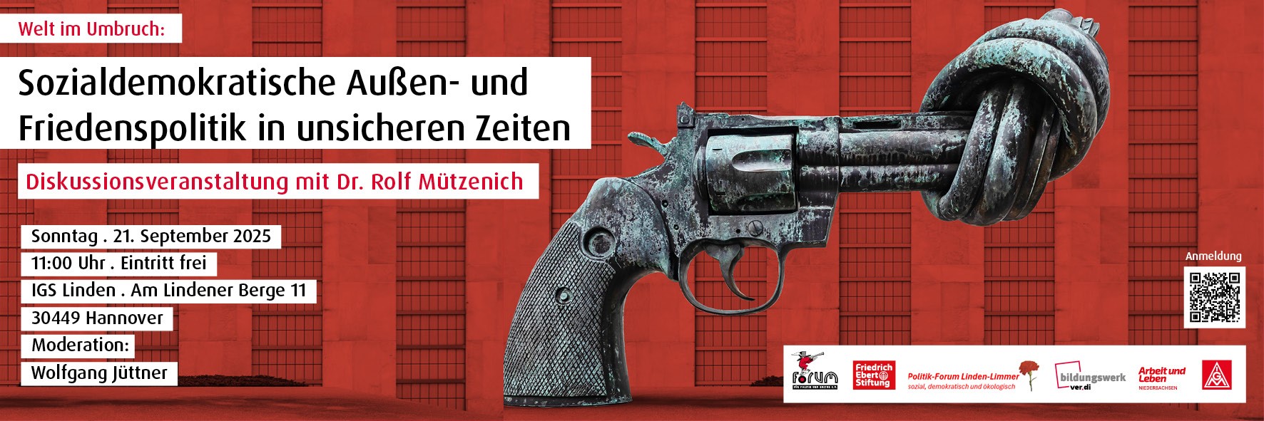 Veranstaltung News Geschichte, Kultur, Medien, Netzpolitik Welt im Umbruch: Sozialdemokratische Außen- und Friedenspolitik in unsicheren Zeiten 21.09.2025 11:00 bis 21.09.2025 14:00 - Hannover Terminexport im ICS-Format Diskussionsveranstaltung mit Dr. Rolf Mützenich Bild: Urheber: FES 25_09_21_EK_Friedenspolitik_Hannover.pdf 122 KB Sonntag, 21.09.25 Hannover freie Plätze Welt im Umbruch: Sozialdemokratische Außen- und Friedenspolitik in unsicheren Zeiten Veranstaltungsnummer: 285325 – als .ics herunterladen Die globale Ordnung befindet sich im Umbruch: Neue Machtzentren entstehen, alte Bündnisse geraten ins Wanken und geopolitische Kriege und Konflikte nehmen zu. Während autoritäre Staaten zunehmend an Einfluss gewinnen, geraten Demokratie, Multilateralismus sowieinternationale Zusammenarbeit und Solidarität weltweit unter Druck. Vor diesem Hintergrund stellen sich zentrale Fragen für die deutsche und europäische Außenpolitik: Welche Rolle kann Europa in einer multipolaren Welt einnehmen? Wie gehen wir mit systemischen Herausforderern wie China um? Wie lassen sich Multilateralismus, Völkerrecht und internationale Kooperation in einer zunehmend konfrontativen Welt verteidigen? Und welche Herausforderungen und Chancen ergeben sich daraus für eine sozialdemokratische Außen- und Friedenspolitik? Dateien 25_09_21_EK_Friedenspolitik_Hannover.pdf Termin Sonntag, 21.09.2511:00- Uhr Registrierung möglich bis Sonntag, 21.09.25 Teilnahmepauschale keine Veranstaltungsort IGS Linden Am Lindener Berge 1130449 Hannover Ansprechpartner_in Stephan Meuser niedersachsen@fes.de Kontaktanschrift Friedrich-Ebert-StiftungLandesbüro NiedersachsenTheaterstrasse 330159 HannoverTel. 0511-35770830 Fax. 0511-35770840