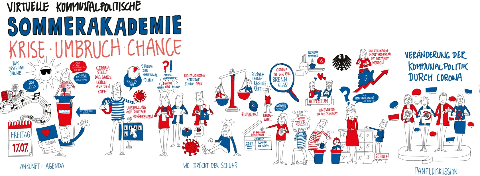 Rückblick Kommunalpolitik | Engagement Poetry Slam, Graphic Recording und Curry-Wurst: Ein Rückblick in Film und Bild auf die erste virtuelle kommunalpolitische Sommerakademie 28.07.2020 Alles war ein wenig anders als sich am 17. und 18. Juli 2020 Kommunalpolitiker_innen und ehrenamtlich Engagierte aus ganz Deutschland zur ersten virtuellen kommunalpolitischen Sommerakademie zusammenfanden. Kein Check-in im Tagungshaus, kein Smalltalk zum Warmwerden, kein Buffet. Stattdessen? Technik-Check und Live-Musik im Break-Out Raum, Poetry-Slam, Graphic Recording und Curry-Wurst! Bild: Urheber: Alexander Lehmann Dienstag, 07.04.2020 Medien und Digitale Welt Engagement Rückblick Presseeinladung "Einen Moment bitte!" - Das war die #KOMK20 in Oberhausen! "Einen Moment bitte!" Länger hat man als Kommunalpolitiker_in oftmals nicht Zeit, um auf sich aufmerksam zu machen. Beim Scrollen über das Display gilt es, unter der Fülle von bunten Bildern und Videos hervorzustechen. Warum sollten Menschen gerade... Bild: Urheber: privat Montag, 18.05.2020 Engagement Integration Integrationspolitik Blog Bildung "Dem Integrationsrat fehlt eine starke Lobby" - Ein Interview mit Tayfun Keltek zur Wahl der Integrationsräte In ungefähr der Hälfte aller Bundesländer gibt es einen Ort, an dem sich Bürger_innen mit Zuwanderungsgeschichte kommunal engagieren: Die Integrations- oder Ausländerräte oder –beiräte. In Nordrhein-Westfalen ist Tayfun Keltek seit mehreren... Mittwoch, 20.05.2020 Digitalisierung Kommunalpolitik Klimawandel, Energie und Umwelt Digitale Formate (NICHT anklicken, bitte spez. Unterkategorie wählen) Presseeinladung Kommunal - Regional - Digital: Vier Online-Diskussionen zu kommunalen Herausforderungen Die Welt ist im Wandel – nicht erst seit Beginn der Corona-Krise. Mobilitätswende, Klimawandel, Strukturwandel und Digitalisierung stellen vier der großen Herausforderungen für die Kommunen dar. Zu diesen Themen möchten wir uns mit Ihnen austauschen,... Graphic Recording vom Freitag, 17.07. (als pdf) Der Einladung der KommunalAkademien Baden-Württemberg, Bayern und NRW zur ersten rein virtuellen Sommerakademie folgten ca. 140 Teilnehmer_innen aus ganz Deutschland. Zwei Tage lang sollten die Herausforderungen der Covid-19-Pandemie auf kommunalpolitischer Ebene analysiert und besprochen werden. „Wo drückt der Schuh?“, so die offene Eingangsfrage am ersten Abend: Ob Digitalisierung, Schule oder die Frage nach den Konsequenzen für die kommunalen Haushalte – zahlreiche Themenfelder rückten ins Blickfeld. Die Pandemie als "Brennglas" bestehender Probleme Immer wieder hieß es, die Pandemie verstärke die Probleme, die bereits vorhanden seien: Sei es beispielsweise die schwierige Situation bildungsferner Kinder und Jugendlicher im Home Schooling, die Notlage manch ärmerer Familien durch plötzliche Arbeitslosigkeit, oder die Belastungsgrenzen unseres Pflege- und Gesundheitssystems und der dort Beschäftigten. Die Pandemie als Brennglas. Diesen Eindruck bestätigte das hochkarätig besetze Panel aus Kommunal- und Bundespolitik. Saskia Esken, MdB und Parteivorsitzende der SPD, Ulrich Maly, Oberbürgermeister a.D. aus Nürnberg und Charlotte Britz, Oberbürgermeisterin a.D. aus Saarbrücken, diskutierten unter der Moderation von Daniela Harsch, Bürgermeisterin in Tübingen, zu der Frage, was Corona nun verändern werde – oder bereits verändert hat. Auch die Teilnehmer_innen konnten sich an der Diskussion beteiligen, ob durch Fragen oder kritische Anmerkungen. Die Technik machte es möglich! Workshops und Markt der Möglichkeiten Am folgenden Samstag erhöhte sich die Schlagzahl: In neun Workshops konnten die Teilnehmer_innen ganz unterschiedliche Themen beleuchten. Ob „Digitale Zusammenarbeit in der Kommunalpolitik“, die „Moderation virtueller Sitzungen“ oder aber inhaltliche Fragen zu „Kommunalen Haushalten in der Corona Krise“ und der Gestaltung „Resilienter Kommunen“ – eine breite Palette aus Themenfeldern forderte zum Mitmachen auf. Spätestens hier rollten die ersten Schweißperlen, die Temperaturen am Mittag: sommerlich heiß in ganz Deutschland! Projekte aus Regensburg, Ulm, Bornheim, Biberach, Tübingen, Böblingen, Langenau und Mannheim Am späten Nachmittag lud der „Markt der Möglichkeiten“ ein, sich mit Ehrenamtlichen auszutauschen, die während des "Lockdowns" in ihren jeweiligen Kommunen Projekte ins Leben riefen, die nun darüber hinaus Bestand haben. Projekte aus Regensburg, Ulm, Bornheim, Biberach, Tübingen, Böblingen, Langenau und Mannheim überzeugten nicht nur durch Einfallsreichtum und Kreativität, sondern insbesondere durch beherztes Anpacken, den Mut, Neues zu wagen und eine gute Portion Durchhaltevermögen. Inspiriert, zufrieden und ein wenig erschöpft lauschten die Teilnehmer_innen zum Ende des zweiten Tages der poetischen Zusammenfassung durch Dalibor Marković und Dominique Macri, zugeschaltet aus Mexiko-Stadt und dem Salzburger Land. Graphic Recording vom Samstag, 18.07. (als pdf) Nicht nur inhaltlich behalten wir zwei erkenntnisreiche Konferenz-Tage in Erinnerung, vielmehr hat die technische Umsetzbarkeit Anreize gesetzt, ein ähnliches Format auch in post-coronalen-Zeiten nicht gänzlich aus den Augen zu verlieren. Wir bedanken uns bei allen Teilnehmer_innen und Mitwirkenden und freuen uns auf baldiges Wiedersehen: ob off- oder online! <<Das war das Programm>> Den Rückblick gibt's hier auch als Video! Dieses Video wird über Youtube zur Verfügung gestellt. Um es anzusehen, müssen Sie unseren Marketing-Cookies zustimmen. Weitere Hinweise finden Sie in den ausführlichen Datenschutzhinweisen. Marketing-Cookies akzeptieren und Video laden