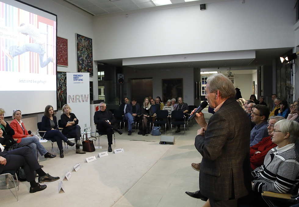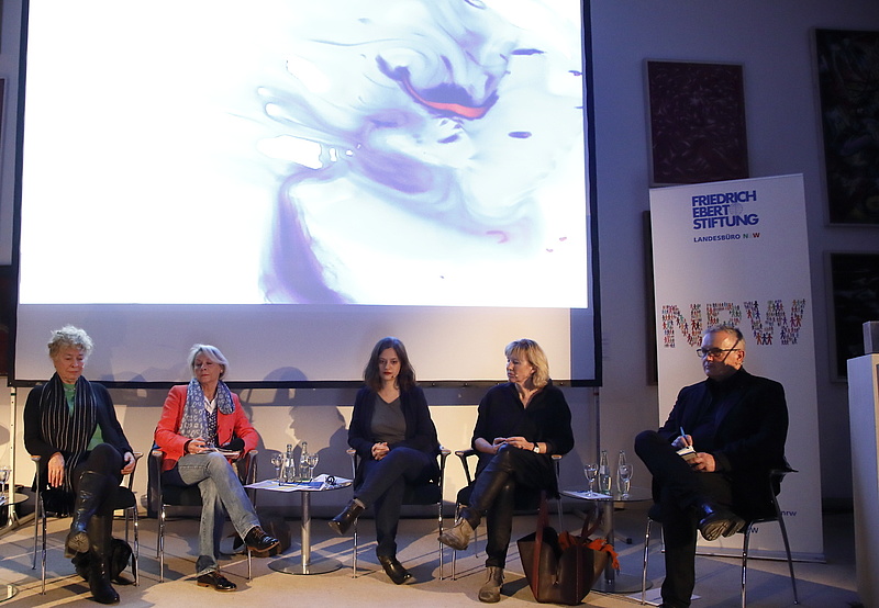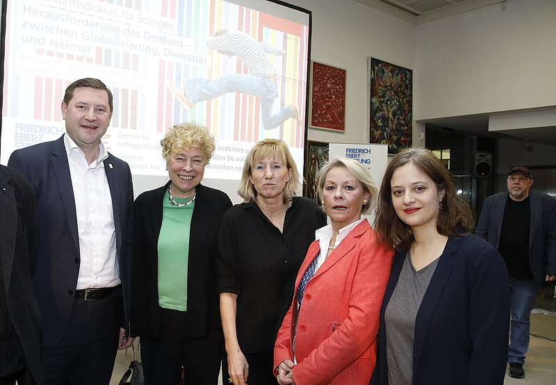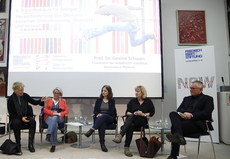 Mit Leidenschaft und Empathie diskutierten im Zentrum für verfolgte Künste auf Einladung des Landesbüros NRW der Friedrich-Ebert-Stiftung die Politikwissenschaftlerin Prof. Dr. Gesine Schwan (Humboldt-VIADRINA Governance Platform Berlin), die Autorin Prof. Ines Geipel (Berlin), Studiendekan Prof. Dr. Lutz Becker (Hochschule Fresenius Köln), die Schriftstellerin Özlem Özgül Dündar (Solingen) und Solingens Oberbürgermeister Tim Kurzbach über progressive Definitionen von Heimat.
