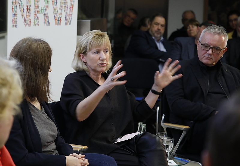 Für Teilhabe als Ansatz für ein Zukunftsmodell von Heimat warb Gesine Schwan auf dem Podium nachdrücklich. „Es gibt natürlich die Heimat der Orte, wo man geboren und aufgewachsen ist oder auch lebt. Es gibt aber auch die Heimat der Zugehörigkeit, bei der es nicht um Gebäude, sondern um Menschen geht“, differenzierte sie zunächst grundsätzlich. Sie sehe, sagte Schwan, auch mit Verständnis für die Verunsicherung vieler Bürgerinnen und Bürger durch die Entwicklungen der vergangenen Jahre weiter, einen engen Zusammenhang zwischen Partizipation und Heimat: „Mit dem Blick nach vorne ist Heimat das, wohin ich gehöre, weil ich mich an der Gestaltung des Ortes beteilige.“ Wenn Menschen, die sich in ihrem gewohnten Umfeld entfremdet fühlten, könnte ihre eigene Teilnahme an einer Entwicklung von Zukunft gemeinsam mit Zugezogenen zu „einer Art organischer Versöhnung“ führen. Es benötige dazu jedoch eines tauglichen Impulses.