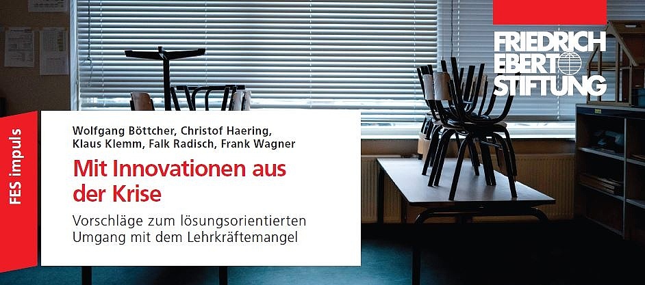 Publikation Hochschulpolitik | Bildung | Berufliche Bildung | Ausbildung FES impuls | Mit Innovationen aus der Krise 05.06.2023 Wolfgang Böttcher, Christof Haering, Klaus Klemm, Falk Radisch, Frank Wagner Mit Innovationen aus der Krise Böttcher, Wolfgang ; Haering, Christof ; Klemm, Klaus ; Radisch, Falk ; Wagner, Frank Zur Publikation Vorschläge zum lösungsorientierten Umgang mit dem Lehrkräftemangel Der dramatische Lehrkräftemangel ist aktuell eines der größten Probleme des deutschen Bildungssystems. Um diese Herausforderung zu bewältigen und allen Kindern und Jugendlichen unabhängig von ihrem Elternhaus gute Bildung zu ermöglichen, müssen jetzt schnelle und wirksame Lösungen gefunden werden. Die im Auftrag der Friedrich-Ebert-Stiftung ausgearbeitete Expertise „Mit Innovationen aus der Krise – Vorschläge zum lösungsorientierten Umgang mit dem Lehrkräftemangel“ enthält vor diesem Hintergrund konkrete, kurzfristig umsetzbare Vorschläge, die sich sowohl an Bildungspolitik und -verwaltung als auch an Schulen und Hochschulen richten