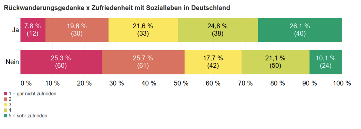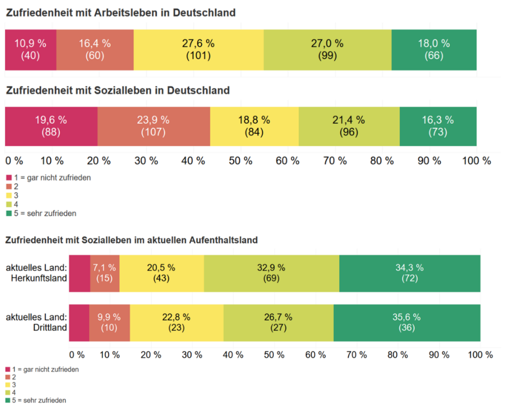 Mehr als 60 Prozent der Teilnehmenden konnten sich zum Zeitpunkt der Befragung nicht vorstellen, nach Deutschland zurückzukehren. Personen, die mit ihrem Sozialleben in Deutschland besonders unzufrieden waren, äußerten noch seltener eine Rückkehrbereitschaft.