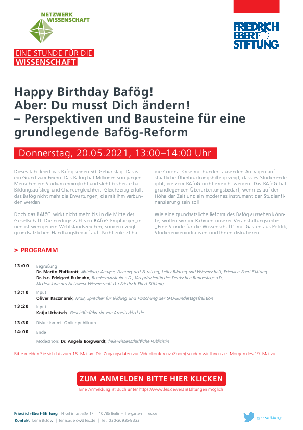 Im Rahmen unserer Veranstaltungsreihe „Eine Stunde für die Wissenschaft“ haben wir mit Oliver Kaczmarek, bildungspolitischer Sprecher der SPD-Bundestagsfraktionund Katja Urbatsch, Geschäftsführerin von Arbeiterkind.de darüber diskutiert wie eine grundsätzliche Reform des Bafög aussehen könnte.