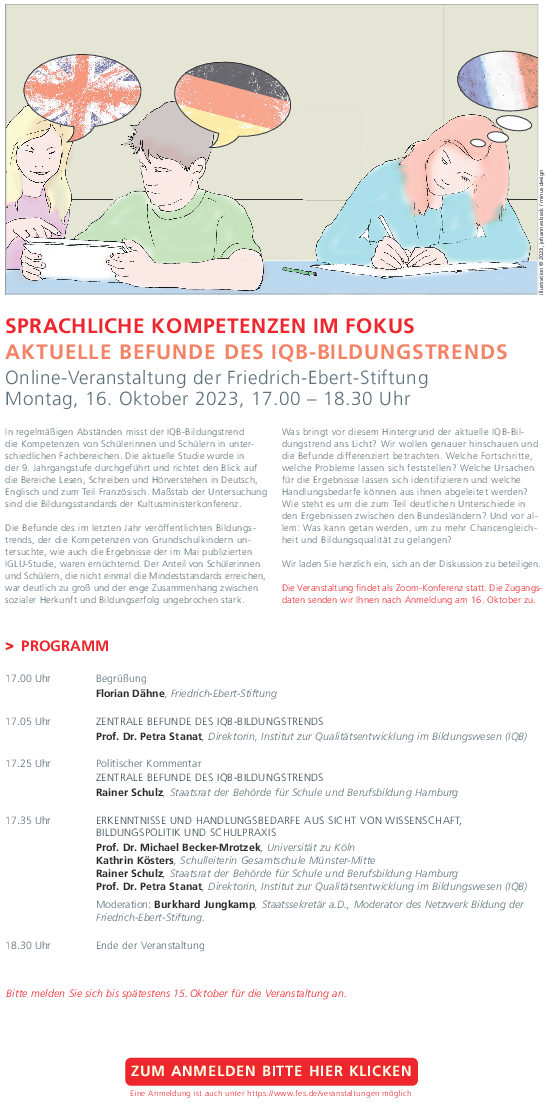 Was bringt vor diesem Hintergrund der aktuelle IQB-Bildungstrend ans Licht? Wir wollen genauer hinschauen und die Befunde differenziert betrachten. Welche Fortschritte, welche Probleme lassen sich feststellen? Welche Ursachen für die Ergebnisse lassen sich identifizieren und welche Handlungsbedarfe können aus ihnen abgeleitet werden? Wie steht es um die zum Teil deutlichen Unterschiede in den Ergebnissen zwischen den Bundesländern? Und vor allem: Was kann getan werden, um zu mehr Chancengleichheit und Bildungsqualität zu gelangen?