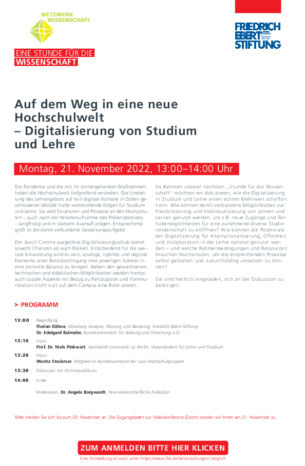 Die Pandemie und die mit ihr einhergehenden Maßnahmen haben die Hochschulwelt tiefgreifend verändert. Die Umstellung des Lehrangebots auf rein digitale Formate in Zeiten geschlossener Hörsäle hatte weitreichende Folgen für Studium und Lehre. Sie wird Strukturen und Prozesse an den Hochschulen – auch nach der Wiederaufnahme des Präsenzbetriebs – langfristig und in starkem Ausmaß prägen. Entsprechend groß ist die damit verbundene Gestaltungsaufgabe. Der durch Corona ausgelöste Digitalisierungsschub bietet sowohl Chancen als auch Risiken. Entscheidend für die weitere Entwicklung wird es sein, analoge, hybride und digitale Elemente unter Berücksichtigung ihrer jeweiligen Stärken in eine sinnvolle Balance zu bringen. Neben den gewachsenen, technischen und didaktischen Möglichkeiten werden hierbei auch soziale Aspekte mit Bezug zu Partizipation und Kommunikation (nicht nur) auf dem Campus eine Rolle spielen. Im Rahmen unserer nächsten „Stunde für die Wissenschaft“ möchten wir diskutieren, wie die Digitalisierung in Studium und Lehre einen echten Mehrwert schaffen kann. Wie können damit verbundene Möglichkeiten zur Flexibilisierung und Individualisierung von Lehren und Lernen genutzt werden, um z.B. neue Zugänge und Teilhabemöglichkeiten für eine zunehmend diverse Studierendenschaft zu eröffnen? Wie können die Potenziale der Digitalisierung für Internationalisierung, Offenheit und Kollaboration in der Lehre optimal genutzt werden – und welche Rahmenbedingungen und Ressourcen brauchen Hochschulen, um die entprechenden Prozesse selbst gestalten und zukunftsfähig umsetzen zu können? Sie sind herzlich eingeladen, sich an der Diskussion zu beteiligen.Anmelden können Sie sich bis zum 20. November unter dem nachfolgenden Anmeldebutton. Den Zoom-Link erhalten Sie nach Ihrere Anmeldung am Vormittag des 21. Novembers.