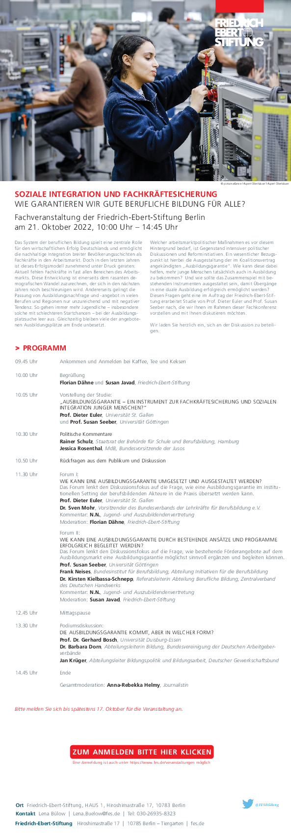 Das System der beruflichen Bildung spielt eine zentrale Rolle für den wirtschaftlichen Erfolg Deutschlands und ermöglicht die nachhaltige Integration breiter Bevölkerungsschichten als Fachkräfte in den Arbeitsmarkt. Doch in den letzten Jahren ist dieses Erfolgsmodell zunehmend unter Druck geraten: Aktuell fehlen Fachkräfte in fast allen Bereichen des Arbeitsmarkts. Diese Entwicklung ist einerseits dem rasanten demografischen Wandel zuzurechnen, der sich in den nächsten Jahren noch beschleunigen wir d. Andererseits gelingt die Passung von Ausbildungsnachfrage und -angebot in vielen Berufen und Regionen nur unzureichend und mit negativer Tendenz. So gehen immer mehr Jugendliche – insbesondere solche mit schlechteren Startchancen – bei der Ausbildungsplatzsuche leer aus. Gleichzeitig bleiben viele der angebotenen Ausbildungsplätze am Ende unbesetzt. Welcher arbeitsmarktpolitischer Maßnahmen es vor diesem Hintergrund bedarf, ist Gegenstand intensiver politischer Diskussionen und Reforminitiativen. Ein wesentlicher Bezugspunkt ist hierbei die Ausgestaltung der im Koalitionsvertrag angekündigten „Ausbildungsgarantie“. Wie kann diese dabei helfen, mehr junge Menschen tatsächlich auch in Ausbildung zu bekommen? Und wie sollte das Zusammenspiel mit bestehenden Instrumenten ausgestaltet sein, damit Übergänge in eine duale Ausbildung erfolgreich ermöglicht werden? Diesen Fragen geht eine im Auftrag der Friedrich-Ebert-Stiftung erarbeitet Studie von Prof. Dieter Euler und Prof. Susan Seeber nach, die wir Ihnen im Rahmen dieser Fachkonferenz vorstellen und mit Ihnen diskutier en möchten.