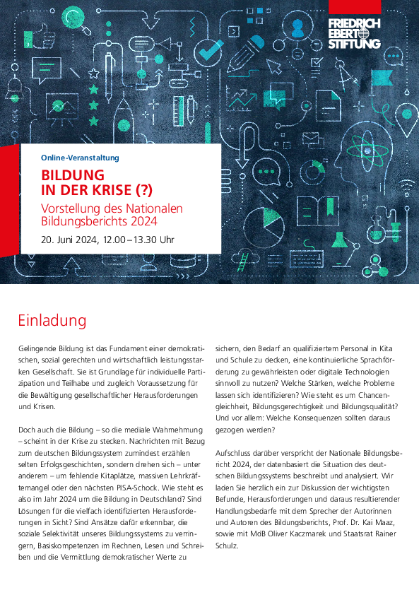 Gelingende Bildung ist das Fundament einer demokratischen, sozial gerechten und wirtschaftlich leistungsstarken Gesellschaft. Sie ist Grundlage für individuelle Partizipation und Teilhabe und zugleich Voraussetzung für die Bewältigung gesellschaftlicher Herausforderungen und Krisen. Doch auch die Bildung – so die mediale Wahrnehmung – scheint in der Krise zu stecken. Nachrichten mit Bezug zum deutschen Bildungssystem zumindest erzählen selten Erfolgsgeschichten, sondern drehen sich – unter anderem – um fehlende Kitaplätze, massiven Lehrkräftemangel oder den nächsten PISA-Schock. Wie steht es also im Jahr 2024 um die Bildung in Deutschland? Sind Lösungen für die vielfach identifizierten Herausforderungen in Sicht? Sind Ansätze dafür erkennbar, die soziale Selektivität unseres Bildungssystems zu verringern, Basiskompetenzen im Rechnen, Lesen und Schreiben und die Vermittlung demokratischer Werte zu sichern, den Bedarf an qualifiziertem Personal in Kita und Schule zu decken, eine kontinuierliche Sprachförderung zu gewährleisten oder digitale Technologien sinnvoll zu nutzen? Welche Stärken, welche Probleme lassen sich identifizieren? Wie steht es um Chancengleichheit, Bildungsgerechtigkeit und Bildungsqualität? Und vor allem: Welche Konsequenzen sollten daraus gezogen werden? Aufschluss darüber verspricht der Nationale Bildungsbericht 2024, der datenbasiert die Situation des deutschen Bildungssystems beschreibt und analysiert. Wir laden Sie herzlich ein zur Diskussion der wichtigsten Befunde, Herausforderungen und daraus resultierender Handlungsbedarfe mit dem Sprecher der Autorinnen und Autoren des Bildungsberichts, Prof. Dr. Kai Maaz, sowie mit MdB Oliver Kaczmarek und Staatsrat Rainer Schulz.