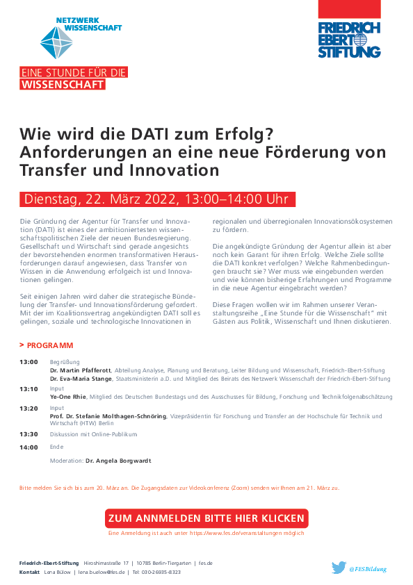 Die Gründung der Agentur für Transfer und Innovation (DATI) ist eines der ambitioniertesten wissenschaftspolitischen Ziele der neuen Bundesregierung. Gesellschaft und Wirtschaft sind gerade angesichts der bevorstehenden enormen transformativen Herausforderungen darauf angewiesen, dass Transfer von Wissen in die Anwendung erfolgeich ist und Innovationen gelingen.