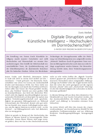 Publikation Hochschulpolitik | Bildung Digitale Disruption und Künstliche Intelligenz – Hochschulen im Dornröschenschlaf? 02.10.2020 Doris Weßels Digitale Disruption und Künstliche Intelligenz - Hochschulen im Dornröschenschlaf? Weßels, Doris Zur Publikation E-Paper der Friedrich-Ebert-Stiftung Die Erstellung von Texten durch Künstliche Intelligenz macht massive Fortschritte und stellt Hochschulen und Wissenschaft vor enorme Herausforderungen: Dies betrifft die Urheberschaft wissenschaftlicher Texte, die Qualitätssicherung und die Schreibkompetenz als akademische Basisdisziplin für kritisches Denken. Neben der Blockchain-Technologie als Lösungsbaustein sollte die Förderung von Schreibkompetenz neu aufgestellt werden. „Störende“ Einflüsse durch KI-generierte Texte werden im Bildungsbereich aber auch dann nur sehr bedingt ausgebremst werden können. Die Herausforderung besteht darin, diese Veränderungsprozesse mitzugestalten. Ansprechpartner Marion Stichler 030 26935 - 7052 Marion.Stichler(at)fes.de