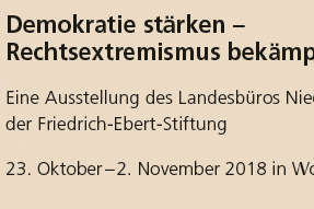 Die Ausstellung "Demokratie stärken - Rechtsextremismus bekämpfen" des Landesbüros Niedersachsen zeigt die Gefahren auf, die vom Rechtsextremismus als Bedrohung für Demokratie und Menschenwürde ausgehen. Sie stellt die Grundlagen für rechtsextremes Verhalten und Einstellungen dar und zeigt, welche Formen rechtsextreme Weltbilder und Argumentationsweisen annehmen können.Wir freuen uns, diese Ausstellung vom 23.10.2018 bis 2.11.2018 in der BBS II in Wolfsburg zeigen zu dürfen.Bei der Ausstellungseröffnung am Dienstag, 23. Oktober 2018 um 9.30 Uhr werden sprechen:Marianne Broska, Schulleiterin der BBS2 WolfsburgFalko Mohrs, Mitglied des Deutschen BundestagesMarcel Schäfer, Sportdirektor des VFL Wolfsburg und ehemaliger NationalspielerUrban Überschär, Leiter des Landesbüros Niedersachsen der Friedrich-Ebert-Stiftung