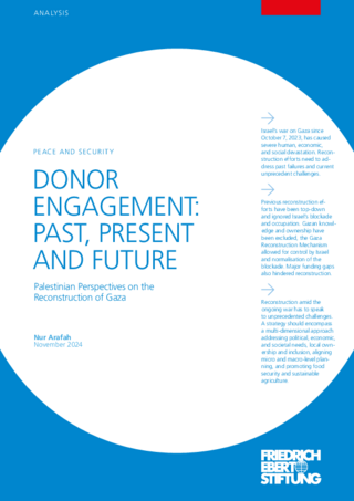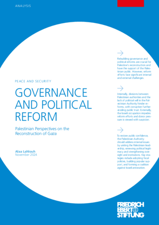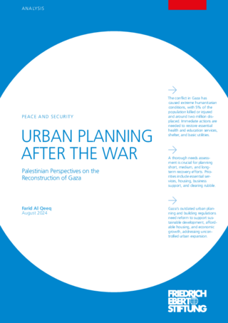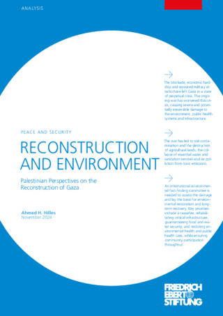 Frieden und Sicherheit Palästinensische Perspektiven auf den Wiederaufbau von Gaza 10.10.2024 Wie können der Wiederaufbau und die Zukunftsplanung im Gazastreifen nach dem Ende des Krieges aussehen? Eine neue Studienreihe beleuchtet erstmals die Bedürfnisse und Prioritäten der palästinensischen Bevölkerung. Bild: Urheber: picture alliance / Anadolu | Stringe Mittwoch, 02.10.2024 Strategie der reinen Gewalt Dem Libanon droht ein weiterer langer Krieg, warnt Marcus Schneider, FES-Projektleiter für Frieden und Sicherheit in Beirut, in seinem neuen ipg-Beitrag. Bild: Urheber: picture alliance / Zumapress / Saher Alghorra Freitag, 04.10.2024 Frieden und Sicherheit Die Welt gerecht gestalten „Die Hamas ist in Gaza bei vielen verhasst“ Unser Kollege Usama Antar spricht im ipg-Interview über das Leid der Menschen in Gaza, die Eskalation im Libanon und Deutschlands Image in der arabischen Welt. Bild: Urheber: picture alliance / Associated Press | Ariel Schali Freitag, 04.10.2024 Frieden und Sicherheit Die Welt gerecht gestalten „Die Bedrohung ist real und beständig“ FES-Kollegin Judith Stelmach aus Tel Aviv im ipg-Interview über eine gespaltene Gesellschaft, doppelte Standards gegen Israel und den Angriff Irans. Ansprechperson Dr. Friederike Stolleis 030 26935-7468 Friederike.Stolleis(at)fes.de Bild: Urheber: Palestine News Agency Wafa Im Rahmen des gemeinsamen Projekts „Palästinensische Perspektiven auf den Wiederaufbau von Gaza“ veröffentlichen die Friedrich-Ebert-Stiftung (FES) und die Stiftung Wissenschaft und Politik (SWP) umfassende Analysen zur Wiederaufbau- und Zukunftsplanung des Gazastreifens. Die Studien beleuchten erstmals die Bedürfnisse und Prioritäten der Palästinenser_innen für die Zeit nach dem Ende des noch andauernden Kriegs. Insgesamt elf Beiträge widmen sich zentralen Themenbereichen, die für den Wiederaufbau entscheidend sind. Einblicke in palästinensische Expertise und Empfehlungen zum Wiederaufbau Die Beiträge basieren auf den Erfahrungen, der Expertise und den Perspektiven von Palästinenser_innen. Die Analysen widmen sich zentralen Herausforderungen wie Sicherheit, Regierungsführung, politischer Reform, der Rolle von Frauen, Umweltfragen und Stadtplanung. Dabei wird der Gazastreifen nicht isoliert betrachtet, sondern als integraler Teil der seit 1967 von Israel besetzten palästinensischen Gebiete verstanden. Die in den Studien vorgestellten kurz- und langfristigen Ansätze sind darauf ausgerichtet, mit dem Grundsatz der palästinensischen Selbstbestimmung vereinbar zu sein. Bedarfsanalyse und Handlungsempfehlungen für die Zeit nach dem Krieg Der jüngste Krieg im Gazastreifen hat bestehende humanitäre Krisen massiv verschärft. Laut den Vereinten Nationen waren im Juli 2024 bereits 63 Prozent der Gebäude im Gazastreifen entweder zerstört oder stark beschädigt. Das Gesundheitssystem, die Infrastruktur und das Bildungssystem sind weitgehend zusammengebrochen, und auch die Umwelt erleidet durch den Krieg massive Schäden. Die Analysen des Projekts bieten einen Überblick über die notwendigen Schritte, um die Region für die Zeit nach dem Konflikt wiederaufzubauen. Neben der physischen Wiederherstellung wird ein Fokus auf die Reform der Sicherheitsarchitektur sowie des politischen Systems gelegt. Ziel ist es, die unveräußerlichen Rechte der Palästinenser_innen in Gaza, dem Westjordanland und Ostjerusalem zu sichern und eine langfristige politische Lösung des israelisch-palästinensischen Konflikts anzustreben. Die Bedeutung palästinensischer Perspektiven für den Wiederaufbau und die internationale Zusammenarbeit Entscheidend für den Wiederaufbauprozess ist die Einbindung palästinensische Akteur_innen und ihrer lokalen Expertise. Gleichzeitig muss die internationale Gemeinschaft frühzeitig miteinbezogen werden, um sich der Herausforderung des Wiederaufbaus zu stellen und der gemeinsamen Verantwortung gerecht zu werden. Dazu gehört die Koordinierung des Wiederaufbaus mit der Zivilgesellschaft vor Ort, mit regionalen Partnern sowie internationalen Organisationen. Die gemeinschaftlich entwickelten Lösungen müssen den Bedürfnissen der betroffenen Bevölkerung entsprechen und langfristige Stabilität sichern. Ansprechperson zur Studienreihe: Dr. Friederike Stolleis, friederike.stolleis(at)fes.de, Referat Naher/Mittlerer Osten und Nordafrika Detaillierte Informationen zu unserem Standort und lokalen Partnerorganisationen: FES Palästina Reconstruction and environment Palestinian perspectives on the reconstruction of GazaBonn, 2024 Hilles, Ahmed H. Palestinian perspectives on the reconstruction of Gaza / Ahmed H. Hilles ; Issuing Department: Friedrich-Ebert-Stiftung, Department for Middle East and North Africa. - Bonn : Friedrich-Ebert-Stiftung e.V., November 2024. - 17 Seiten = 250 KB, PDF-File. - (Analysis). - (Peace and security)Electronic ed.: Bonn : FES, 2024ISBN 978-3-98628-601-9 Zum Download (PDF) Donor engagement: past, present and future Palestinian perspectives on the reconstruction of GazaBonn, 2024 Arafah, Nur Palestinian perspectives on the reconstruction of Gaza / Nur Arafah ; Issuing Department: Friedrich-Ebert-Stiftung, Department for Middle East and North Africa. - Bonn : Friedrich-Ebert-Stiftung e.V., November 2024. - 10 Seiten = 140 KB, PDF-File. - (Analysis). - (Peace and security)Electronic ed.: Bonn : FES, 2024ISBN 978-3-98628-621-7 Zum Download (PDF) Governance and political reform Palestinian perspectives on the reconstruction of GazaBonn, 2024 Lahlouh, Alaa Palestinian perspectives on the reconstruction of Gaza / Alaa Lahlouh ; Issuing Department: Friedrich-Ebert-Stiftung, Department for Middle East and North Africa. - Bonn : Friedrich-Ebert-Stiftung e.V., November 2024. - 10 Seiten = 140 KB, PDF-File. - (Analysis). - (Peace and security)Electronic ed.: Bonn : FES, 2024ISBN 978-3-98628-622-4 Zum Download (PDF) Restoring Palestinian economic unity Palestinian perspectives on the reconstruction of GazaBonn, 2