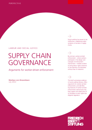 Interview Weltwirtschaft und Unternehmensverantwortung Supply chain governance Supply chain governance Von Broembsen, Marlese Zur Publikation Wir brauchen eine Sorgfaltspflicht für Lieferketten, die auch von Arbeitnehmenden und ihren Vertretern mitgestaltet wird. Warum, erläutert Marlese von Broembsen in einer neuen FES-Publikation. Bild: Urheber: picture alliance / ZUMAPRESS.com | Mustasinur Rahman Alvi Freitag, 08.04.2022 Weltwirtschaft und Unternehmensverantwortung Schutz von Frauen in globalen Lieferketten? Nur mit geschlechtergerechten Gesetzen! Multinational agierende Unternehmen haben es bisher verpasst, Frauenrechte ausreichend zu schützen und Geschlechtergerechtigkeit zu fördern. Ein neuer W7-Blogbeitrag der FES von Franziska Korn und Karolin Seitz. Dienstag, 04.10.2022 Hybridveranstaltung Die Welt im Wandel – Lieferkettengesetze als Chance? Hybride Internationale Konferenz am 18. Oktober 2022, 9:00 – 14:00 Uhr mit Hubertus Heil, Lara Wolters, Dr. Bärbel Kofler und anderen. Hier anmelden. Ansprechpartnerin Bild: Urheber: Konstantin Börner Franziska Korn +49 30 269 35-7469 franziska.korn(at)fes.de Bild: Urheber: picture alliance / photothek | Thomas Koehler Interview mit Marlese von Broembsen, Leiterin des Bereichs Recht bei der internationalen Organisation WIEGO (Women in Informal Employment: Globalizing and Organizing) Welche Bedeutung hat Heimarbeit für globale Lieferketten und die internationale Arbeitsteilung? Heimarbeit bedeutet, dass Menschen Güter - oder Teile davon - in ihrer Privatwohnung herstellen. Heimarbeitende arbeiten in den verschiedensten Branchen und somit in zahlreichen globalen Lieferketten. Laut Schätzungen der Internationalen Arbeitsorganisation gibt es weltweit 49 Millionen Heimarbeitende. Dabei sind abhängige Vertragsnehmende noch nicht mitgezählt. Eine Analyse von 340 Textilfabriken in zwei indischen Städten ergab, dass 58 Prozent von ihnen Arbeit an Heimarbeitende vergeben. Für die Unternehmen hat Heimarbeit mehrere Vorteile: Sie kann Fluktuationen in der Nachfrage abfangen; es können spezialisierte Arbeiten wie Stickereien übernommen werden, die nur schwer in Fabriken erledigt werden können; nicht zuletzt spart sie Raum-, Energie- und Gerätekosten. Da die Arbeit unreguliert ist, werden Heimarbeitende zudem geringer entlohnt als Fabrikarbeitende. Wie werden die Rechte von Heimarbeitenden geschützt? In den meisten Ländern des Globalen Südens haben Heimarbeitende keine Rechte, weil sie juristisch als selbstständige Vertragsnehmende gelten. In Thailand gibt es Gesetze, um Heimarbeitende zu schützen, aber Arbeitgebende haben damit gedroht, die Produktion nach Myanmar zu verlagern, wenn diese Gesetze durchgesetzt werden. Das Problem kann also nicht allein auf der nationalen Ebene gelöst werden. Wären Heimarbeitende lieber in Fabriken beschäftigt? Wenn nicht, warum nicht? Viele Heimarbeitende sind Frauen und für sie ist es wichtig von zu Hause zu arbeiten. Entscheidend ist für sie, dass ihre Arbeitnehmerinnenrechte gemäß ILO-Übereinkommen Nr. 177 über Heimarbeit respektiert werden. Es gibt vier Gründe, warum sie wollen, dass die Heimarbeit nicht abgeschafft, sondern geschützt wird: Erstens bekommen ältere Arbeitnehmerinnen in Fabriken keine Arbeit. So stellen Fabriken beispielsweise in Thailand angeblich keine Arbeitnehmende über 40 ein. In Indonesien werden Menschen über 50 aus der Fabrikarbeit gedrängt, und Fabrikarbeitende in Vietnam sind im Schnitt 25 Jahre alt. Ein Zitat aus einer Studie des Professors Mark Anner fasst die Intensität der Arbeit in Fabriken, die für den Export produzieren, gut zusammen: „Für sie [die Fabrikbesitzenden] sind wir wie Zuckerrohr. Sobald wir ausgequetscht sind, werfen sie uns raus.“ Heimarbeit zu verbieten würde bedeuten, Männer und Frauen über 40 vom Arbeitsmarkt zu verdrängen. Zweitens können kulturelle und religiöse Normen Frauen daran hindern, außer Haus zu arbeiten. Heimarbeit ermöglicht ihnen, einer Lohnarbeit nachzugehen. Drittens gibt Heimarbeit auch Menschen aus den dörflichen Regionen Zugang zu Arbeit. Die Auftraggebenden bringen die Rohmaterialien in die Dörfer und holen die fertigen Waren wieder ab. Viertens lässt sich Heimarbeit mit der Versorgung von Kindern, Enkelkindern und älteren sowie kranken Verwandten teilweise besser vereinbaren. Wann schützt gesetzlich verankerte unternehmerische Sorgfaltspflicht Heimarbeitende? Zunächst muss die Gesetzgebung alle Arbeitnehmenden über die gesamte Lieferkette hinweg abdecken – egal, welchen Beschäftigtenstatus sie haben. Das ist wichtig, weil die Menschenrechte aller Arbeitnehmenden zu achten sind, aber auch noch aus einem anderen Grund: Eine Studie der Cornell University über fünf Sektoren kam zu dem Ergebnis, dass Zulieferunternehmen in der Regel eine Fabrik haben, die sich an Verhaltenskodizes hält, und dann Arbeit an weitere Fabriken outsourcen, die sich nicht daran halten. Studien haben gezeigt, dass Gesetze, die sich nicht auf alle Arbeitnehmenden erstrecken, die Informalisierung von Arbeit begünstigen. Das bedeutet, dass einige Arbeitnehmende den Preis dafür zahlen, dass die Rechte der anderen gewahrt werden. Zweitens können Arbeitnehmende sich nicht wehren, wenn sie nicht wissen, für welche Marke sie produzieren. Die Fabriken halten diese Information geheim. Wenn Heimarbeitende oder ihre Organisationen versuchen, die Namen herauszufinden, werden sie bedroht. Gesetzliche Regelungen sollten daher eine Transparenzklausel enthalten, die Unternehmen dazu verpflichtet, dafür zu sorgen, dass jeder und jede einzelne Arbeitnehmende in ihrer Lieferkette einen Arbeitsvertrag hat, in dem die Namen der Marken genannt sind, für die gearbeitet wird. Eine Arbeitsgruppe aus 14 Interessenvertretungen von Heimarbeitenden aus neun Ländern hat sich mit der Frage befasst, wie der Schutz von Heimarbeitenden gesetzlich verankert werden kann. Die Ergebnisse wurden als Forderungen an die EU-Kommission übergeben. 