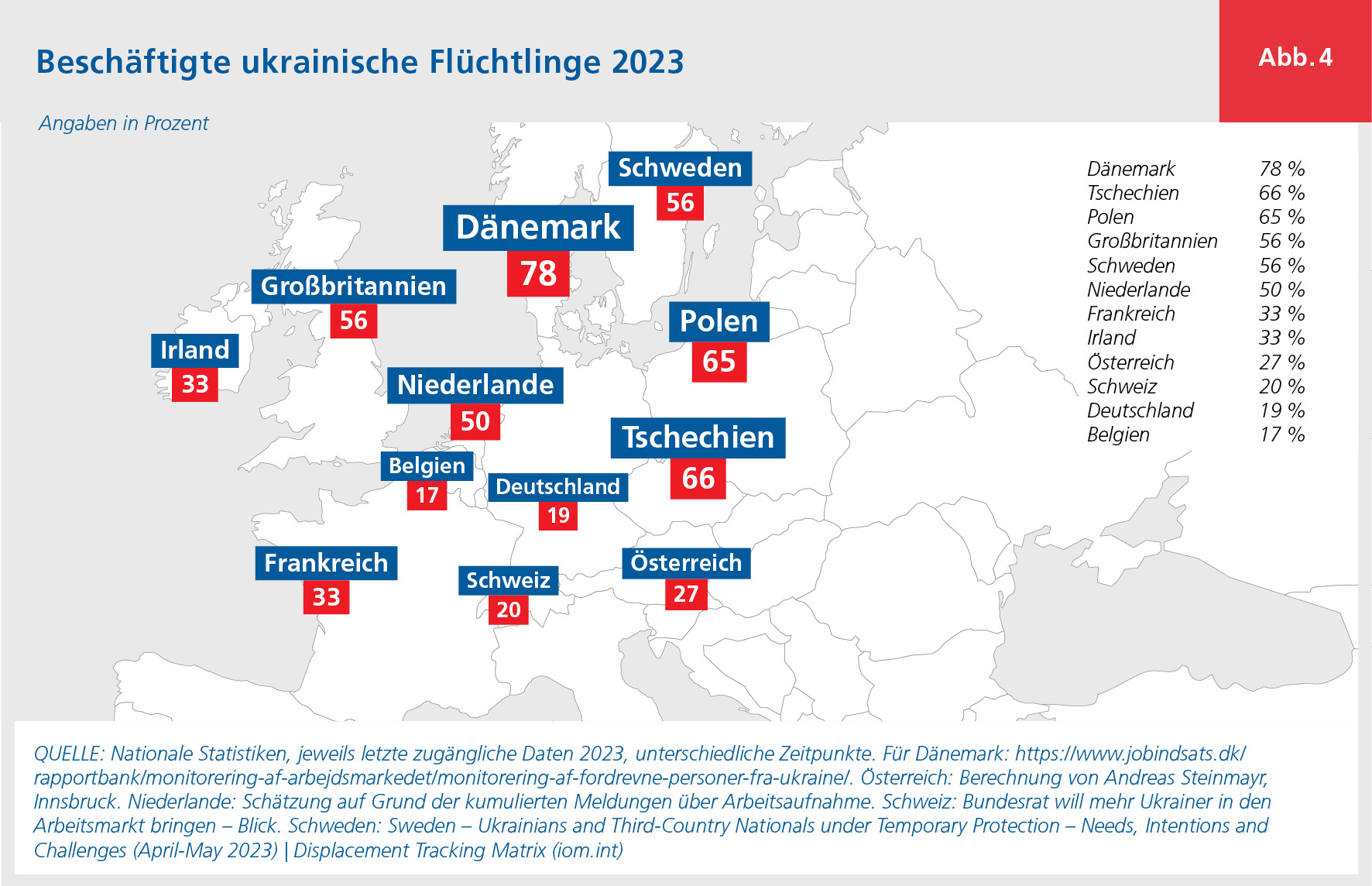 Im September 2023 hatten in Dänemark 77 Prozent der ukrainischen Kriegsflüchtlinge eine bezahlte Beschäftigung gefunden, in Polen und Tschechien etwa zwei Drittel, in den Niederlanden, Großbritannien und Irland über die Hälfte der Ukrainer_innen. In Deutschland sind es dagegen nur 19 Prozent, in der Schweiz 20 Prozent, in Österreich 27 Prozent. Der Blick auf andere Länder ist gerade für Deutschland interessant, denn in der aktuellen deutschen Debatte entsteht der Eindruck, Flüchtlinge und auch die gut ausgebildeten Ukrainer_innen müssten immer eine Belastung sein. Oder neuerdings, man müsse sie zur Arbeit drängen.