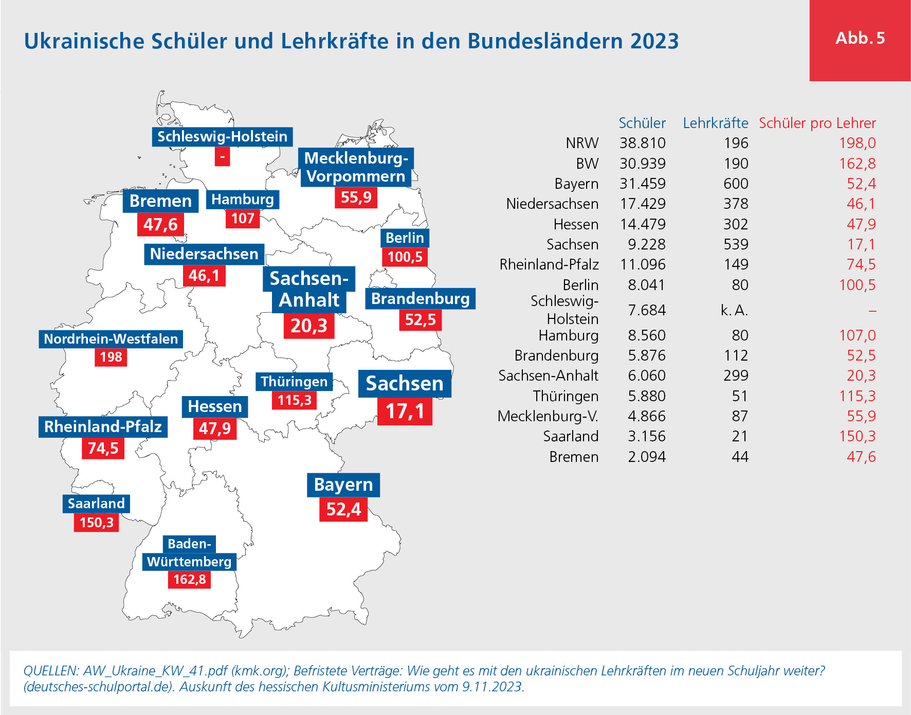 Alle Bundesländer leiden unter Lehrermangel und hatten mit der plötzlichen Ankunft von etwa 200.000 ukrainischen Schüler_innen eine große Aufgabe zu bewältigen. Die Bereitschaft, mit ukrainischen Lehrer_innen zu arbeiten, war von Anfang an sehr unterschiedlich.[3] Sachsen rekrutierte rasch ukrainische Lehrer_innen, zunächst ausschließlich für die Betreuung ukrainischer Kinder. In einem zweiten Schritt ist vorgesehen, deutschsprechende ukrainische Lehrer_innen für den allgemeinen Schuldienst einzustellen. Sachsen hat damit die Hälfte seines Fehlbedarfs abgedeckt. Musterbeispiel ist eine Lehrerin, die schon in der Ukraine Deutsch und Englisch unterrichtet hat.  Rechnerisch kommt in Sachsen eine ukrainische Lehrerin auf 17,1 ukrainische Schüler_innen, in Sachsen-Anhalt 20,3, in Nordrhein-Westfalen dagegen eine Lehrerin auf 198,0 Schüler_innen. Das macht klar, welche Chance genutzt und welche ausgelassen worden ist.