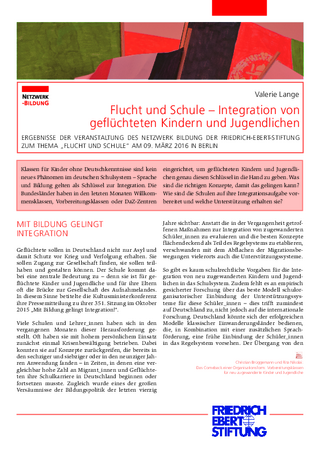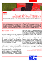 Publikation Integrationspolitik Integration von geflüchteten Kindern und Jugendlichen Flucht und Schule - Integration von geflüchteten Kindern und Jugendlichen Lange, Valerie Zur Publikation Sprache und Bildung sind Schlüssel zur Integration. Wie sind Schulen auf diese Aufgabe vorbereitet und welche Unterstützung erhalten sie? Klassen für Kinder ohne Deutschkenntnisse sind kein neues Phänomen im deutschen Schulsystem. Sprache und Bildung gelten als Schlüssel zur Integration. Die Bundesländer haben in den letzten Monaten Willkommensklassen, Vorbereitungsklassen oder DaZ-Zentren eingerichtet, um geflüchteten Kindern und Jugendlichen genau diesen Schlüssel in die Hand zu geben. Was sind die richtigen Konzepte, damit das gelingen kann? Wie sind die Schulen auf ihre Integrationsaufgabe vorbereitet und welche Unterstützung erhalten sie? Ansprechpartnerin: Marei John-Ohnesorg, Leiterin Bildungs- und Hochschulpolitik der FES Dienstag, 28.06.2016 Publikation Integrationspolitik Gesundheitsversorgung für Flüchtlinge pragmatisch verbessern Deutschland hat ein leistungsstarkes Gesundheitssystem. Unnötige Bürokratie steht der Gesundheitsversorgung Geflüchteter jedoch oft im Wege. Dienstag, 28.06.2016 Publikation Integrationspolitik Refugees welcome – Hochschulzugang für Geflüchtete Teilhabe an Bildung und Ausbildung. Was sind die Regelungen und Hürden beim Hochschulzugang?