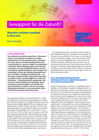 Publikation News Gute Gesellschaft – Soziale Demokratie 2017plus | Demokratie | Medien und Digitale Welt | Kultur als Brücke Gewappnet für die Zukunft? Öffentlich-rechtlicher Rundfunk in Österreich 06.01.2022 Maren Beaufort Gewappnet für die Zukunft? Beaufort, Maren Zur Publikation Das fünfte Impulspapier aus der Reihe zum Stand des ÖRR in Europa analysiert den aktuell guten Stand des öffentlich-rechtlichen Rundfunks in Österreich sowie die Herausforderungen und notwendigen Anpassungen, um diesen zu schützen. Bild: Urheber: dpa picture alliance / Zoonar / fabio lotti Bild: Urheber: privat Der öffentlich-rechtliche Rundfunk (ÖRR) in Österreich wird im europäischen Vergleich mit hohen Reichweiten und Vertrauenswerten verbunden. Um seine starke und demokratiepolitisch relevante Position zu wahren, bedarf es verbesserter rechtlicher Rahmenbedingungen und unternehmerischen wie journalistischen Mutes, sich den veränderten gesellschaftlichen Erwartungen und neuartigen Formen des Mediennutzungsverhaltens zu stellen. Strategisch bedeutet das − neben einer modernisierten Organisationsstruktur − mehrdimensional umgesetzte Vielfalt, die unterschiedliche Vorstellungen demokratischen Zusammenlebens als oberste Programmrichtlinie versteht, und ein neuartiges, kooperatives Denken in transnationalen, plattformisierten Kommunikationsräumen. Den großen Herausforderungen für den ÖRR in Österreich kann also begegnet werden, so beschreibt es die Autorin Dr. Maren Beaufort. Dazu benennt sie in ihren Empfehlungen u.a. die Befähigung zur demokratischen Teilhabe, indem der ÖRR bereits vorhandene Bereitschaft der Bürger_innen aktiviert, sie dann aber auch z.B. durch Foren für Interaktion und Engagement ermöglicht. Ein erweiterter Journalismus wird dafür benötigt, ebenso wie die enge Kooperation mit anderen Medien, gemeinnützigen Organisationen und den Bürger_innen. Die Publikation „Gewappnet für die Zukunft? Öffentlich-rechtlicher Rundfunk in Österreich“ ist die fünfte in unserer Reihe zum Stand des ÖRR in Europa. Wir empfehlen zudem unser Blogprojekt auf Social Europe Towards a European digital public sphere Entwicklung des öffentlich-rechtlichen Rundfunks in Österreich Bild: Urheber: tigerworx lizensiert unter FES CC BY 4.0 Ansprechperson: FES Medienpolitik, Katrin D. Dapp Katrin.Dapp(at)fes.de Bild: Urheber: Nicolas Lladino Silva, unsplash Montag, 21.12.2020 Publikation Medien und Netzpolitik Medien und Digitale Welt Verlorene Ausstrahlung? Öffentlich-rechtlicher Rundfunk in Großbritannien In der neuen Reihe zum "Öffentlich-rechtlichen Rundfunk in Europa" ist das erste Impulspapier erschienen: Der Medienwissenschaftler Des Freedman analysiert klug die Situation der PSB in Großbritannien und macht konkrete Vorschläge für Reformen. Bild: Urheber: Vitomirov/Getty Images/iStockphoto Montag, 11.01.2021 Publikation Medien und Netzpolitik Medien und Digitale Welt Zick-Zack-Kurs. Öffentlich-rechtlicher Rundfunk in Dänemark Mit "Zick-Zack-Kurs. Öffentlich-rechtlicher Rundfunk in Dänemark" von David Nicolas Hopmann ist das zweite Impulspapier der Reihe zum öffentlich-rechtlichen Rundfunk in Europa erschienen. Bild: Urheber: dpa pa CTK Kamaryt Michal Dienstag, 09.02.2021 Publikation Medien und Netzpolitik Medien und Digitale Welt Unersetzlich und umkämpft. Öffentlich-rechtlicher Rundfunk in der Tschechischen Republik In der Reihe zum Stand des öffentlich-rechtlichen Rundfunks in Europa ist das dritte Impulspapier erschienen.