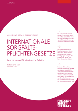 Gewerkschaften national | Gewerkschaften international | Die Welt gerecht gestalten | Weltwirtschaft und Unternehmensverantwortung Lieferkettengesetz im Lockdown? Internationale Sorgfaltspflichtengesetze Grabosch, Robert Zur Publikation Wer oder was steht dem Kabinett im Weg? Frankreich, die Niederlande und die USA machen vor, wie wirksame Gesetze aussehen. Ein Vergleich. Bild: Urheber: Michael Kuchinke-Hofer Montag, 13.07.2020 Gewerkschaften international Die Welt gerecht gestalten Weltwirtschaft und Unternehmensverantwortung »Ja zum Lieferkettengesetz« - das sagt auch die IG BCE Ein Gesetz soll Unternehmen verpflichten, Menschenrechte und Umweltschutz einzuhalten. Was meint die IG BCE? Klare Worte von Michael Vassiliadis. Bild: Urheber: Michael Kuchinke-Hofer Dienstag, 22.09.2020 Gewerkschaften und gute Arbeit Gewerkschaften national Gewerkschaften international »Freiwilligkeit funktioniert nicht. Wir brauchen einen gesetzlichen Rahmen!« Nach über 7 Jahren Rana-Plaza-Einsturz: Über Stärken, Bedeutung und Chancen eines deutschen Lieferkettengesetzes, spricht Bärbel Kofler. Ansprechpartnerin Bild: Urheber: Konstantin Börner Franziska Korn +49 30 269 35-7469 franziska.korn(at)fes.de Bild: Urheber: SickRick / photocase.de Die Diskussionen um ein deutsches Lieferkettengesetz laufen auf Hochtouren. Ziel des Gesetzes ist, dass Unternehmen Menschenrechte weltweit schützen. Obwohl die Argumente für ein Gesetz deutlich auf dem Tisch liegen, stocken die Verhandlungen. Seit Wochen wird darauf gewartet, dass die Eckpunkte des Gesetzes im Kabinett diskutiert werden. Widerstand kommt von Teilen der CDU/CSU sowie der Unternehmensverbände. Dabei ist der Koalitionsvertrag deutlich: kommt eine Überprüfung zu dem Ergebnis, dass die freiwillige Selbstverpflichtung der Unternehmen nicht ausreicht, wird die Regierung gesetzlich tätig. Die Überprüfung hat zweimal stattgefunden. Die Ergebnisse eindeutig: Freiwilligkeit führt nicht zum Ziel. Nur weniger als 20 Prozent der befragten Unternehmen kommen ihrer unternehmerischen Sorgfaltspflicht ausreichend nach. Sprich: vier von fünf Unternehmen tun das nicht! Warum und worauf also warten? Andere Länder machen seit Langem vor, was möglich ist. Frankreich, die Niederlande, Großbritannien haben bereits eigene Gesetze. Auch außerhalb Europas, beispielsweise in den USA oder in Australien schreiben Gesetze fest, dass Unternehmen weltweit Menschenrechte achten müssen. Gemein ist diesen Ländern das Ziel präventiv Menschenrechtsverletzungen entgegenzuwirken. Also, da anzusetzen, dass es erst gar nicht zu Menschenrechtsverletzungen kommt. Denn eines ist klar: die Vergangenheit und insbesondere auch die aktuelle Corona-Pandemie zeigen, zu viele Menschenrechtsverletzungen fanden statt bei denen auch Unternehmen beteiligt waren. Was wirkt? Was funktioniert nicht? Und warum? Viele der Regelungen sind erst seit Kurzem im Kraft, dennoch kann Deutschland von ihnen viel lernen. Was wirkt? Was funktioniert nicht? Und warum? In Summe zeigt sich: Das bloße Berichten über Sorgfaltspflichten reicht nicht aus. Wirkungsvoll sind die Gesetze und Verordnungen, die zwingende Mindestanforderungen an die anzuwendende Sorgfalt definieren und auch Sanktionen ermöglichen. Dabei muss die gesamte Wertschöpfungskette in den Blick genommen werden. Gesetze, die einen starken Durchsetzungsmechanismus – einschließlich einer zivilrechtlichen Haftung – vorsehen, ermöglichen es Menschen für erlittene Schädigungen auch eine effektive Wiedergutmachung zu erhalten. Die Erfahrungen zeigen auch, dass keine Klagewellen drohen. Genauso gibt es keine empirischen Belege dafür, dass sich Unternehmen wegen Sorgfaltspflichtengesetzen generell aus Regionen zurückziehen oder problematische Produktbestandteile durch andere ersetzen. Für die Effektivität der Gesetze spielt die Einbeziehung von Gewerkschaften und Nichtregierungsorganisationen eine entscheidende Rolle. Die Analyse «Internationale Sorgfaltspflichtengesetze – Lessons Learned für die deutsche Debatte» unterzieht dreizehn Gesetze bzw. Verordnungen aus anderen Staaten einer vergleichenden Untersuchung und setzt diese in Beziehung mit den bereits bekannten deutschen Eckpunkten.