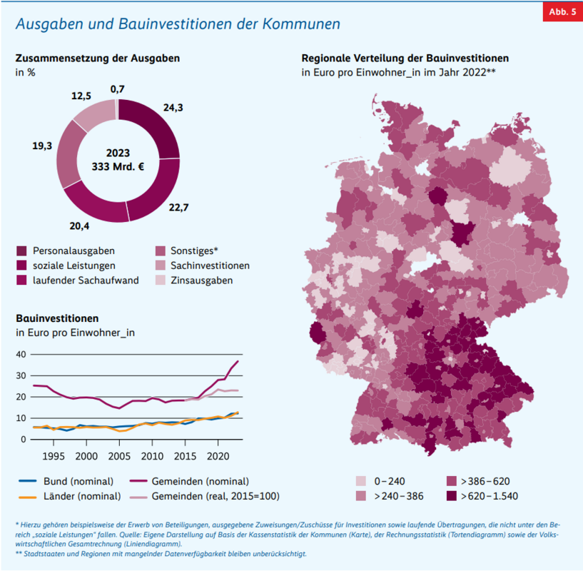 Ein Blick in die die kommunalen Ausgaben zeigt, dass 24 Prozent auf Personalausgaben und rund 23 Prozent auf soziale Leistungen entfallen. Ein gutes Fünftel ist dem laufenden Sachaufwand zuzuordnen – für den Unterhalt von Verwaltungsgebäuden oder Straßen, für Geräte, Mieten, Pachten oder Steuern. Lediglich rund 12,5 Prozent der Ausgaben des kommunalen Gesamthaushalts werden durchschnittlich für Sachinvestitionen getätigt – etwa den Bau von Brücken, Sporthallen oder die Beschaffung von Sachgütern, wie Feuerwehrwagen, Büroausstattung und IT-Lizenzen für die Verwaltung und Rechenzentren.