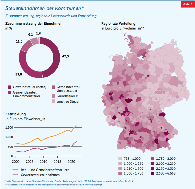 Die Gewerbesteuer ist mit Abstand bedeutendste Kommunalsteuer. Sie erbrachte 2022 rund 48 Prozent der gesamten gemeindlichen Steuereinnahmen. Mit einem guten Drittel der kommunalen Steuereinnahmen im selben Jahr war der Gemeindeanteil an der Einkommensteuer die zweitbedeutendste Steuerart, gefolgt von der Grundsteuer B mit elf Prozent und dem Gemeindeanteil der Umsatzsteuer mit 6,1 Prozent.
